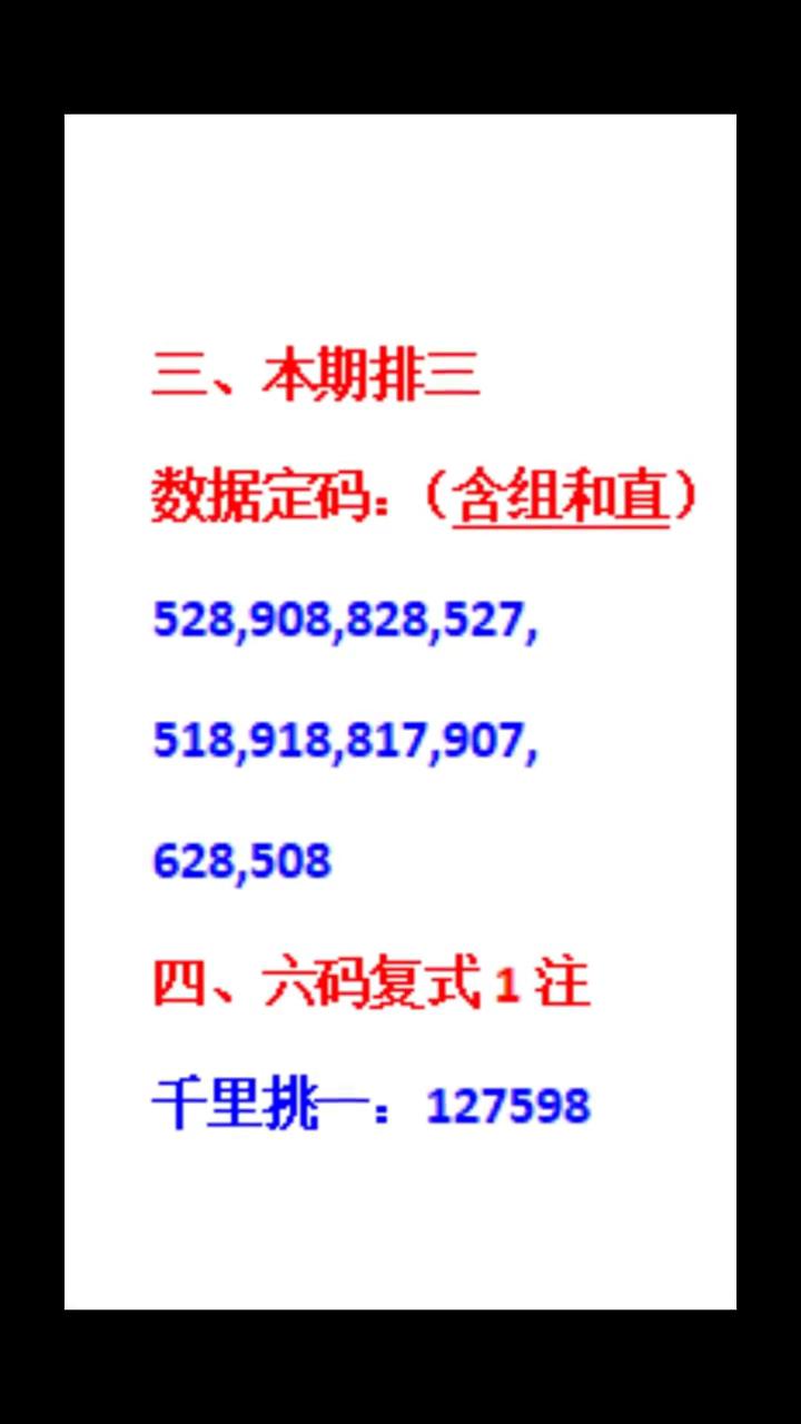 排三317期之解析。 排三317期分析: ·一、形态分析:从本期号码走势来看,为组六。 ·二、本期排三定位:十位:0,1,2,个位:7,8。 ·三、本期排三数据定码:(含组和直)528,908,828,527,518,918,817,907。 ·四、六码复式1注:千里挑一:127598。 祝君好运!切莫照搬!