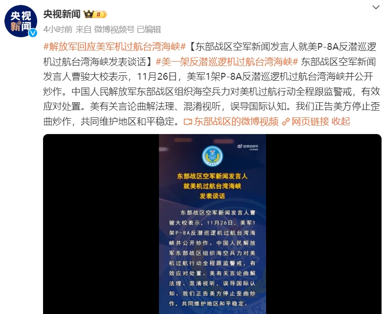 11月26日,美军一架P-8A反潜巡逻机过航台海,同时还公开炒作。解放军东部战区组织海空兵力,对美机行动进行全程跟监警戒,有效应对处置。 其实这样的场景并不陌生,美国带头西方众多盟友跟进,军舰和飞机总是以“自由航行”为借口过航台海。以前解放军实力较弱时期,只能采用无线电警告等方式驱离,现在装备好了军舰更大、飞机更先进,发射红外干扰弹或切航线已经成标配,不知道这次P-8A受到什么样的“热情”迎接。