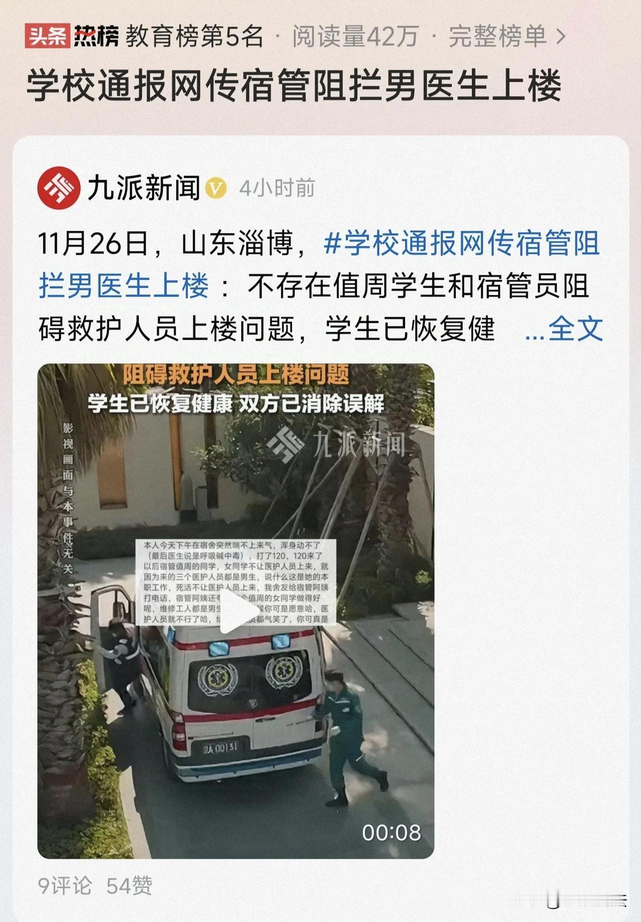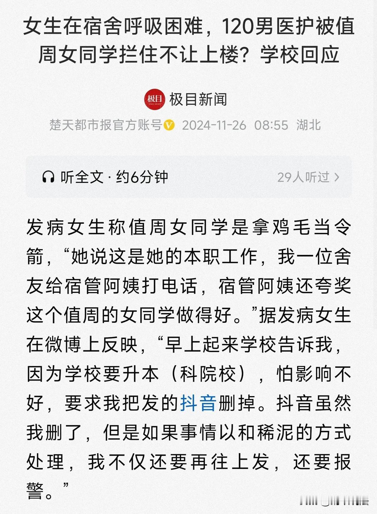 山东,女学生因呼吸性碱中毒需救治,拨打了120求助,万万没想到,值周女生(女学生舍友)和宿管阿姨看到3名120医护人员是男性,竟挡在门口,死活不让对方进入宿舍楼,事发后,学校未就此事给女生一个说法。教育部门一工作人员则回应称,“高校具有这个自主管理权。” (来源:极目新闻) 王同学是淄博某职业学院的学生,学校联系王同学,说学校要升本(科院校),怕影响不好,要求王同学把发的抖音删掉。 王同学妥协了,不愿意让自己的事情影响到学校,但她表示不会继续退步,希望学校能给她一个说法,而不是和稀泥。 事情的起因,是王同学在宿舍突然喘不上气来(呼吸性碱中毒),打了急救电话,接着浑身动不了。 然而,一个值周女同学竟挡在门口,死活不让120救护人员上来,并给宿管阿姨打电话,向宿管阿姨求救。 宿管阿姨赶到,夸奖这个值周的女同学做得好,然后与值周的女同学一起挡住120救护人员。 王同学说,她当时没办法自救,如果不是舍友帮忙,很难想象事情的结果,医生后来说她是呼吸性碱中毒。 事发后,学校工作人员表示,按规定,男生不允许进入女生宿舍楼,“宿舍管理是学工处负责管理。” 宿管阿姨和值周女学生是不是严格执行学校规定,不让任何男性进入女生宿舍,不会任何变通呢? 当然不是,比如男的维修工到宿舍维修,宿管阿姨和值周女学生不会阻拦。 法律怎么看待此事,宿管阿姨和值周女学生可以以有校规为由,拦住120救护人员不让他们进去吗? 首先,学校对在校学生有管理权,这是《教育法》第二十九条之规定,学校有按照章程自主管理的权利。 学校对学生的管理,是有限制的,并不是无限制的管理。 《普通高等学校学生管理规定》第三条,学校要坚持社会主义办学方向,坚持马克思主义的指导地位,全面贯彻国家教育方针;要坚持以立德树人为根本,以理想信念教育为核心,培育和践行社会主义核心价值观,弘扬中华优秀传统文化和革命文化、社会主义先进文化,培养学生的社会责任感、创新精神和实践能力;要坚持依法治校,科学管理,健全和完善管理制度,规范管理行为,将管理与育人相结合,不断提高管理和服务水平。 这一条说了很多内容,比如“以立德树人为根本”“践行社会主义核心价值观,弘扬中华优秀传统文化”。 虽然没有说是否可以限制120进入,但管理权给生命权让步,是理所当然的事情。 其次,如果因为宿管阿姨的阻拦,造成损害后果,学校要承担侵权责任。 《民法典》第1191条,用人单位的工作人员因执行工作任务造成他人损害的,由用人单位承担侵权责任。 宿管阿姨阻拦120救护人员进入宿舍,是在执行校规校纪,属于因执行工作任务造成他人损害,出了问题应该由学校承担侵权责任。 具体的赔偿范围,包括但不限于《民法典》第1179条规定的: “侵害他人造成人身损害的,应当赔偿医疗费、护理费、交通费、营养费、住院伙食补助费等为治疗和康复支出的合理费用,以及因误工减少的收入。造成残疾的,还应当赔偿辅助器具费和残疾赔偿金;造成死亡的,还应当赔偿丧葬费和死亡赔偿金。” 最后,一切规定都必须为生命让道,凡不让道者都应该给予严厉处罚,宿管阿姨今天敢拦120,明天就敢拦110。 现在有些人不管权力大小,只要在自己管辖区域,谁来也不好使,但是对于领导言听计从,这是没有是非观念的体现。 目前,学校发布情况通报,经治疗,该学生已恢复健康,经双方当面沟通后,目前已消除误解。 下一步,我们(学校)将引以为戒! 关注@蚂蚁说法 学校通报网传宿管阻拦男医生上楼 关注时事新闻和法律