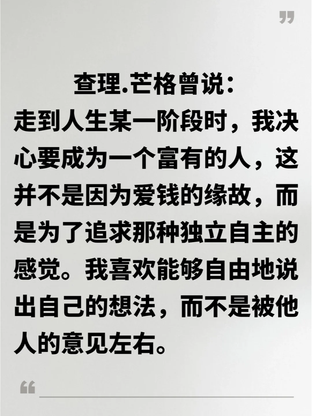 查理·芒格曾说:“走到人生某一阶段时,我决心要成为一个富有之人,这并不是因为爱钱的缘故,而是为了追求那种独立自主的感觉。我喜欢能够自由地说出自己的想法,而不是被他人的意见左右。" 财富,在很大程度上,能够带来自由。从另一个角度来说,财富还意味着安全感。 有句很朴素的话叫:“最好的安全感是饭在锅里,钱在兜里。 人会反目,但钱不会。”因此在现代社会,财务独立才是女人最大的安全感来源。 钱