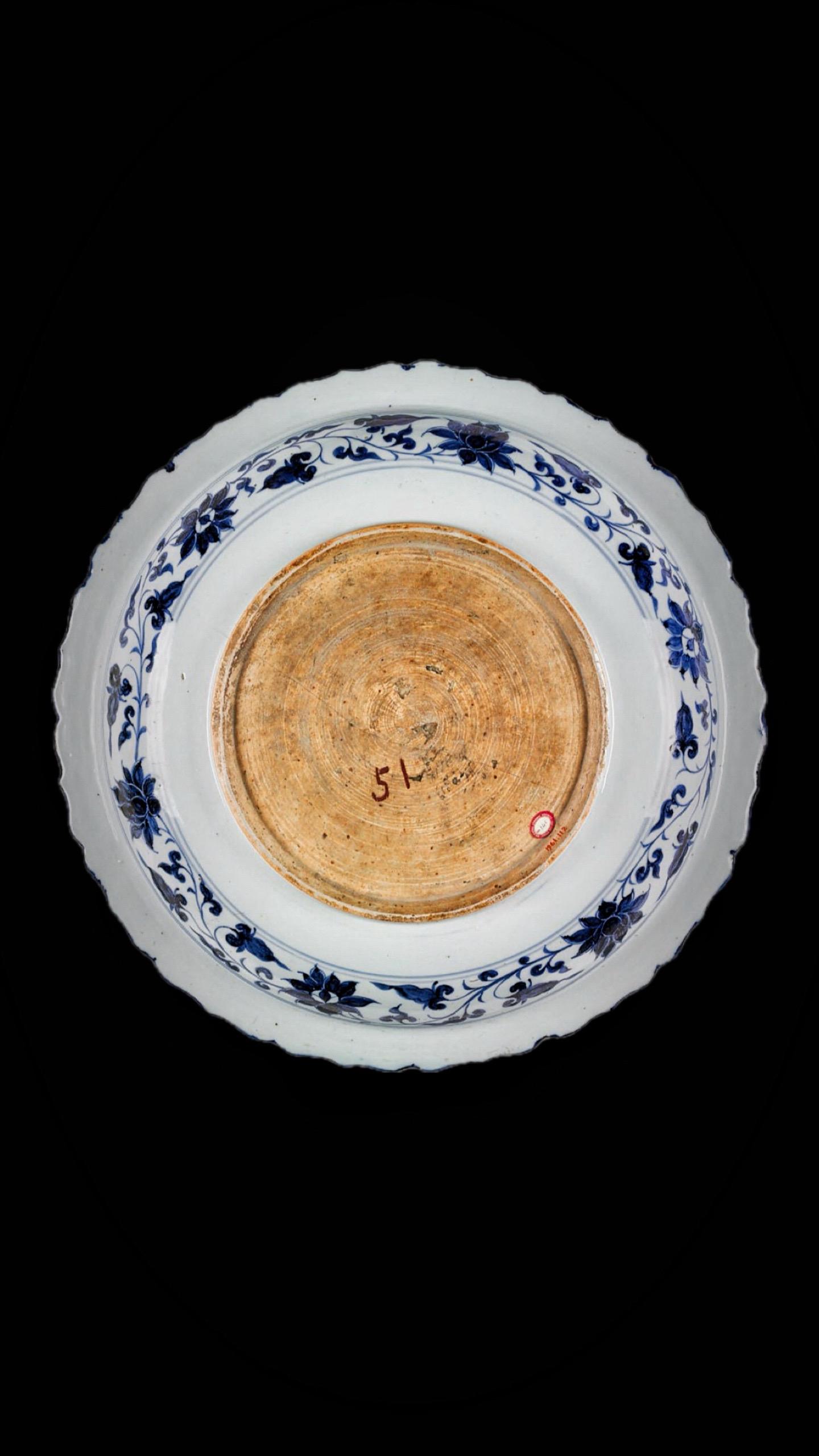 这个盘子的大尺寸和它用阿拉伯文字写的简短、难以理解的铭文(夹在两点位置的模制花卉装饰中)都表明,这只瓷盘是为外销售而制造