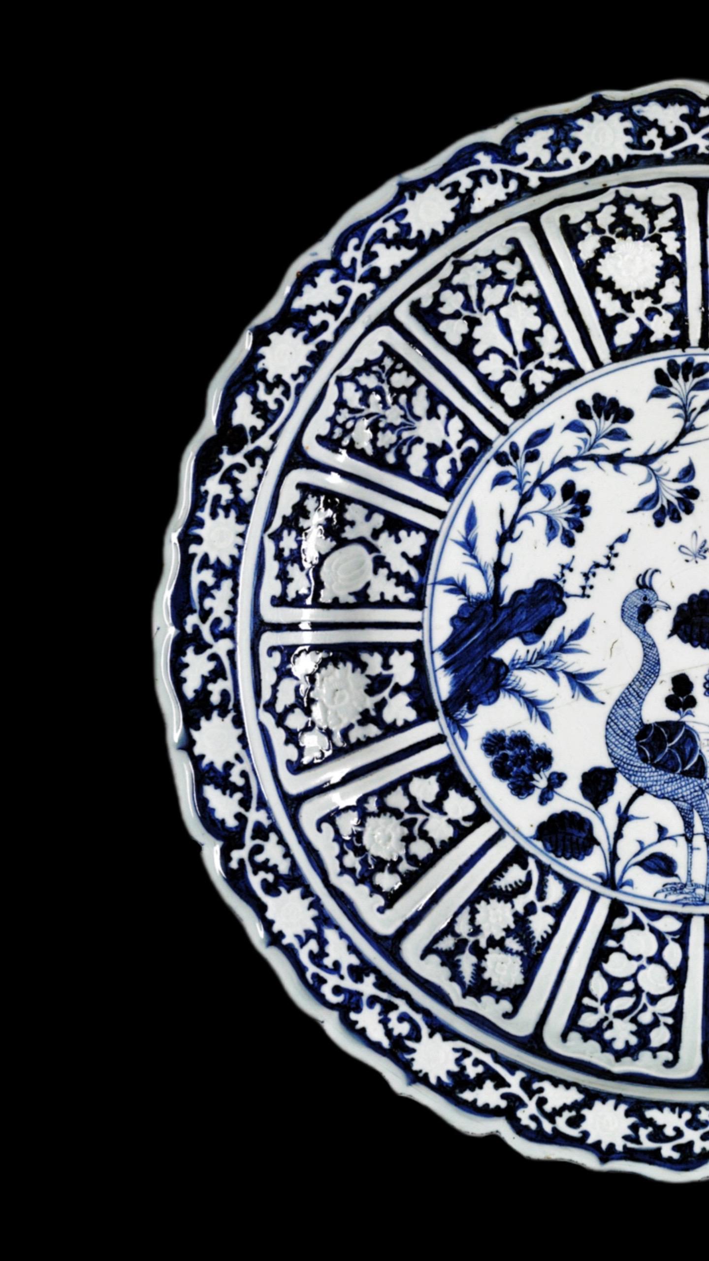 元代·青花荷花孔雀纹大盘。白釉青花一火成,花从釉里透分明