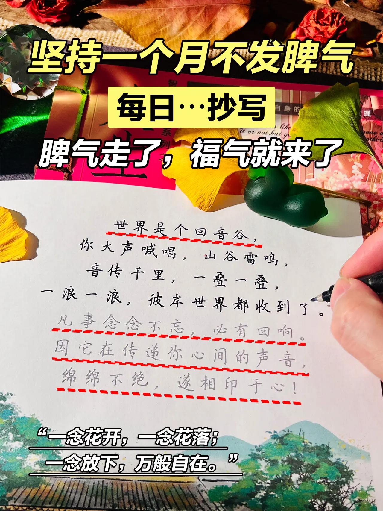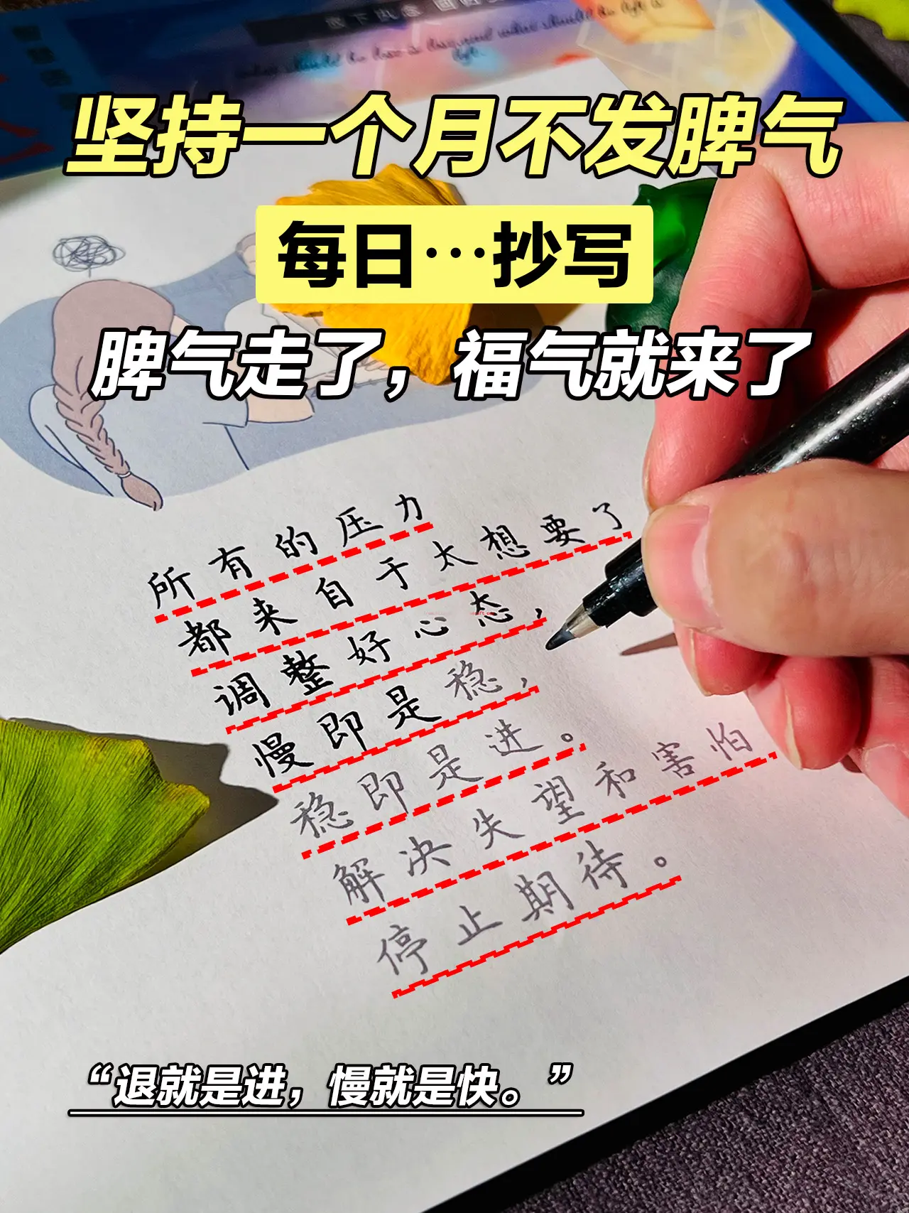 “一个人脾气来了,福气就走了, 如果你是对的,就没必要生气, 如果你是错的,你就没有资格生气。 用嘴伤人,是最愚蠢的行为, 学会控制情绪,是一个人成熟的标志, 控制好了自己情绪, 你的人生就赢了一大半。” 低谷烦躁的时候,不要随意发脾气, 不妨试着抄一抄,让心静下来, 脾气走了,福气就来了。