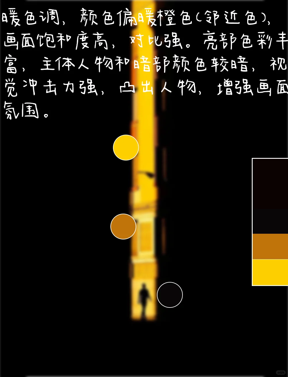 [四R].暖色调,颜色偏暖橙色(邻近色),画面饱和度高,对比强。亮部色彩丰富,主体人物和暗部颜色较暗,视觉冲击力强,凸出人物,增强画面