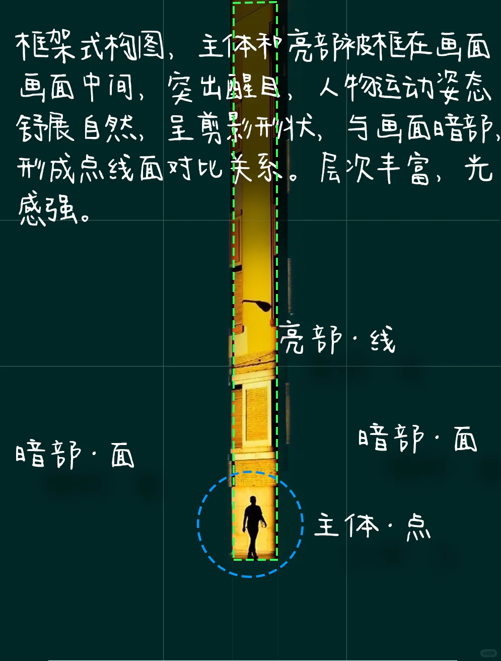 [一R].框架式构图,主体和亮部被框在画面画面中间,突出醒目,人物运动姿态舒展自然,呈剪影形状,与画面暗部,形成点线面对比关系。层次丰富,光感强。