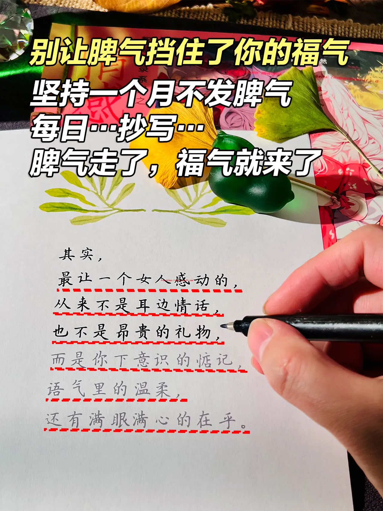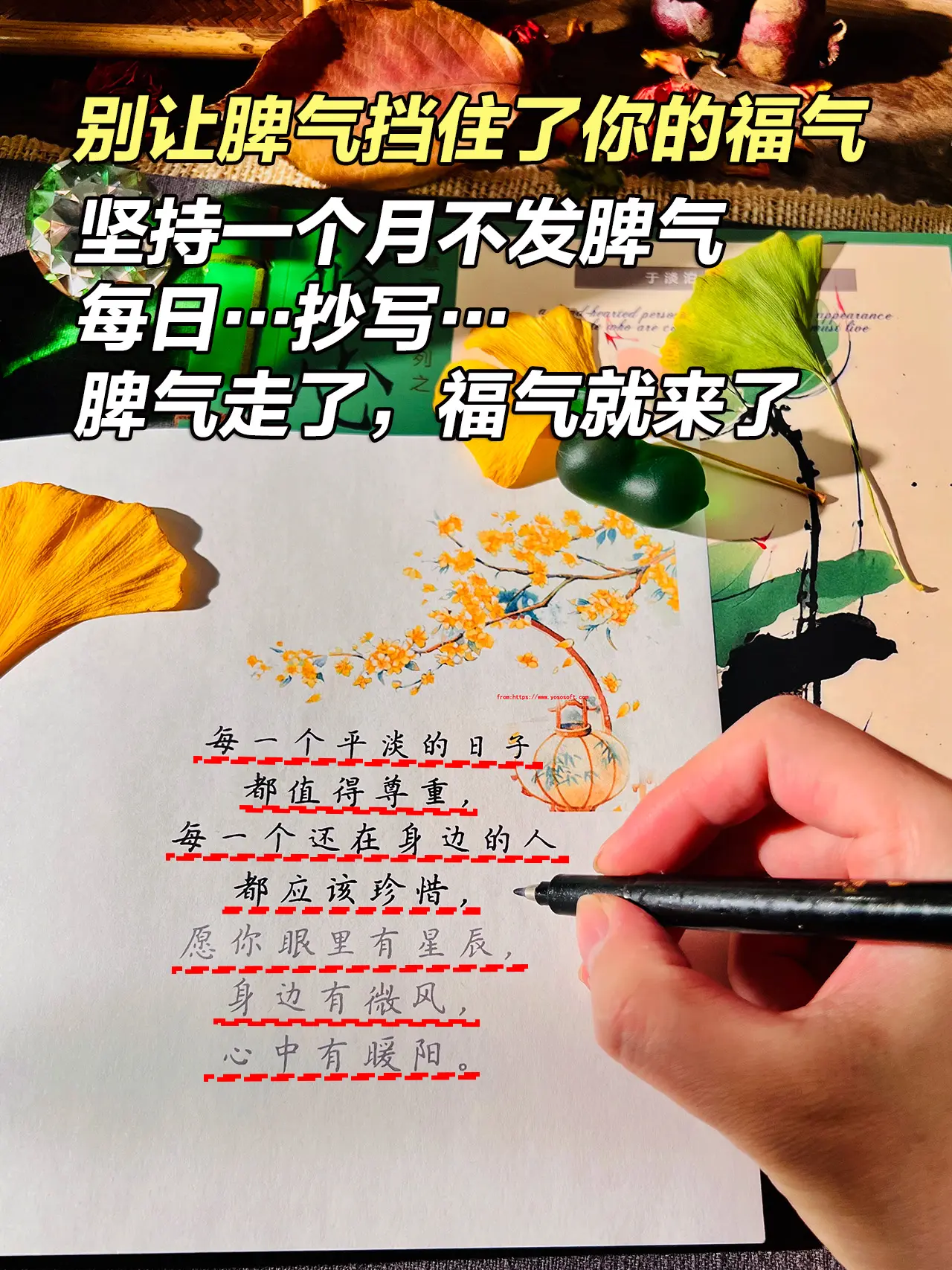 别让你的脾气,阻挡了你的福气!请始终记住,脾气越温,福报越深。低谷烦躁的时候,不要随意发脾气,不妨试着抄一抄,让心慢慢静下来,脾气走了,福气就来了。