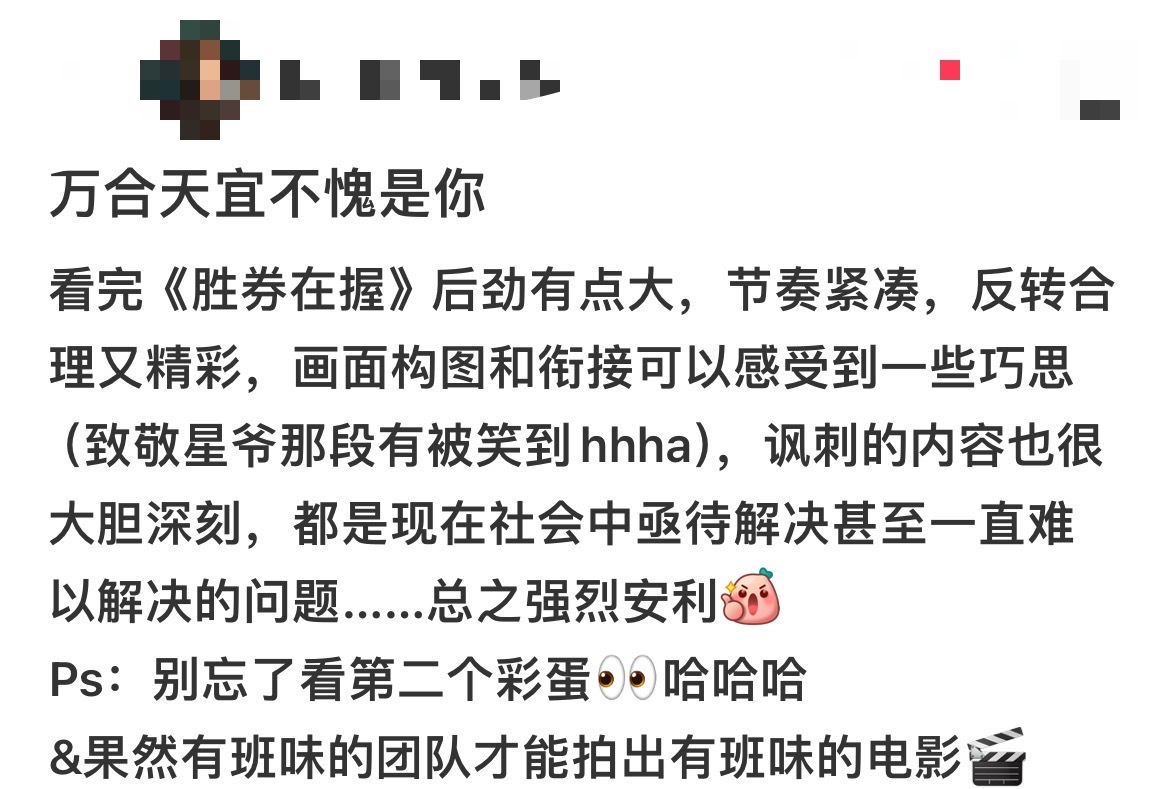 胜券在握讽刺式喜剧 胜券在握看笑了也秒懂了😢电影中真的有很多台词让人会心一笑,比如“镇江的儿子?上海的也不行!”“你这么董事,不也没坐进来吗?”等等,笑出声的同时也品到了其中的讽刺感,不得不说这样的讽刺喜剧更辛辣!更幽默!
