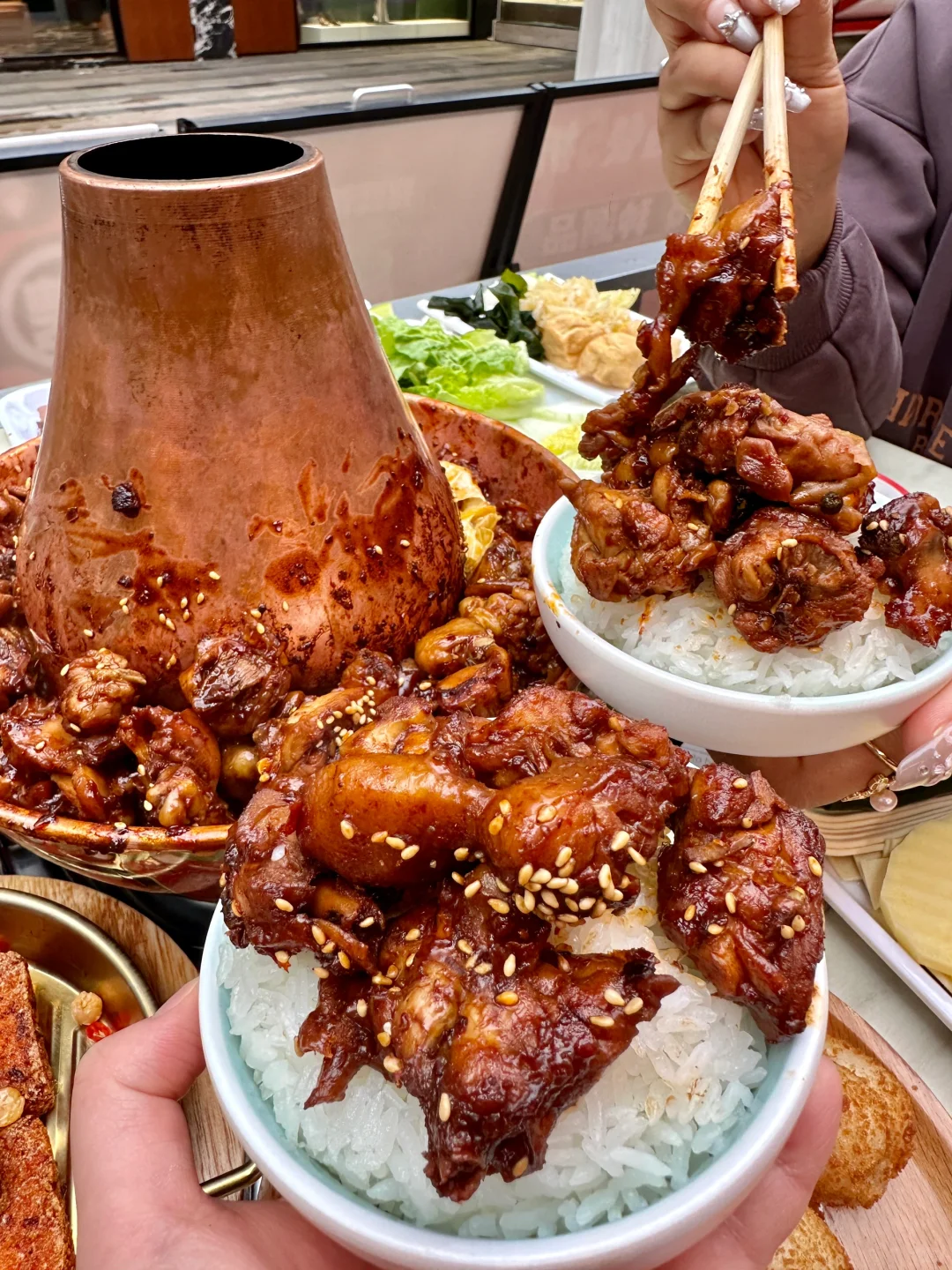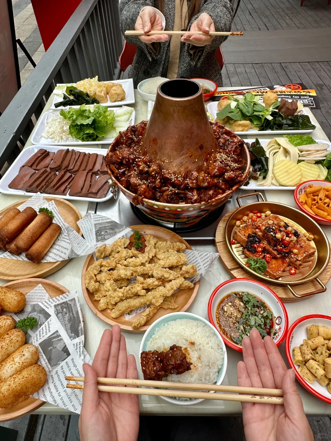 近期光谷朋友带我去吃的一家火锅鸡,真的有被惊艳到!!人均40,好吃又便宜!Chao大一锅,分量实在!好几斤鸡肉,够2到3人吃了!! 鸡肉很鲜嫩入味,微微辣带点甜口~ 蘸秘制蘸料,好吃到舔筷子!😋 配上他家的稻花香东北大米饭,我可以连干三大碗! 18种蔬菜还有小吃是都是自助滴,随便恰~ 脆皮鲜奶、爆浆豆腐也很香~ 吃完还要打包一份回家继续炫~!!
