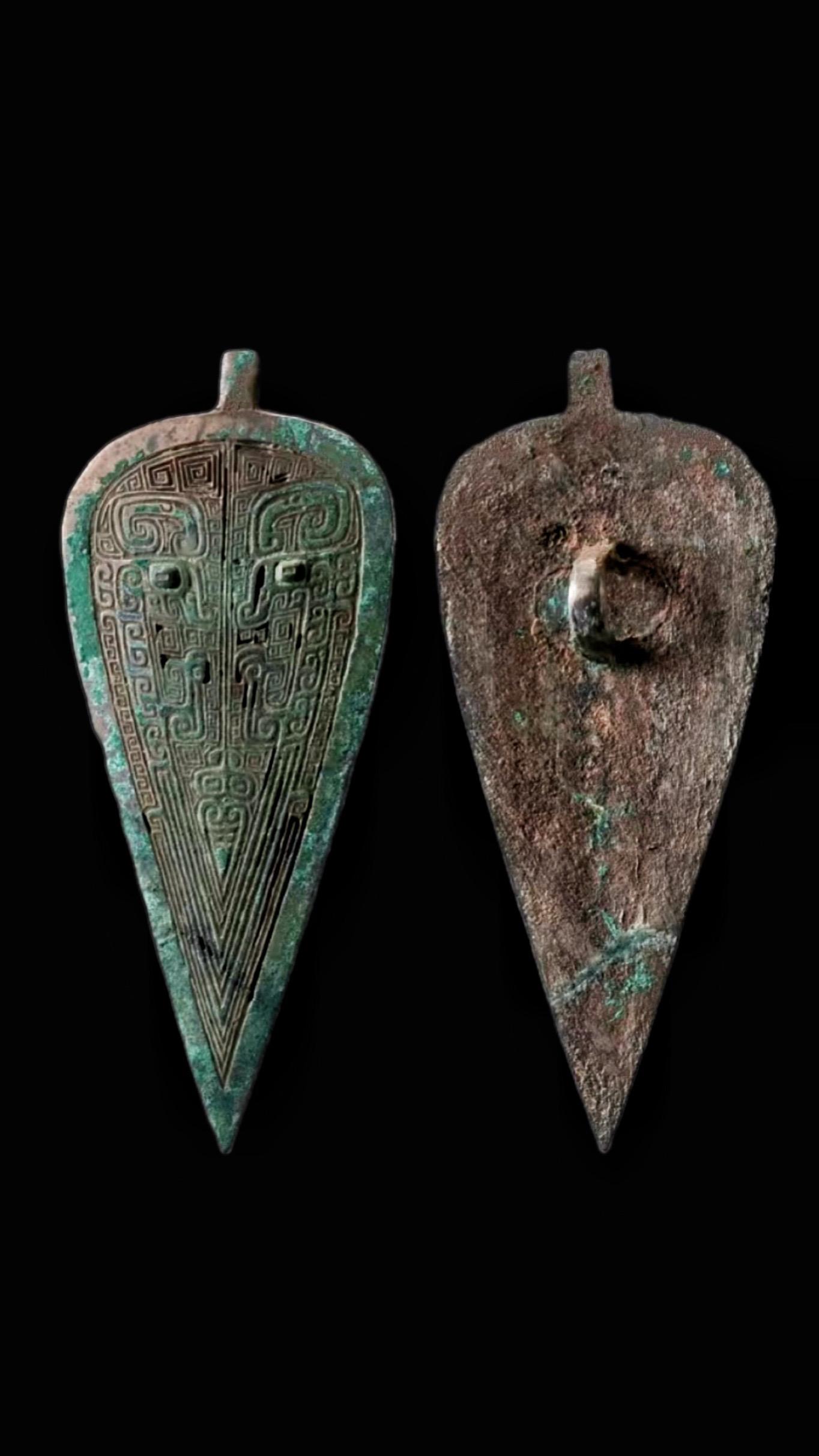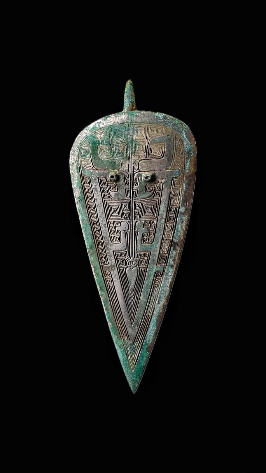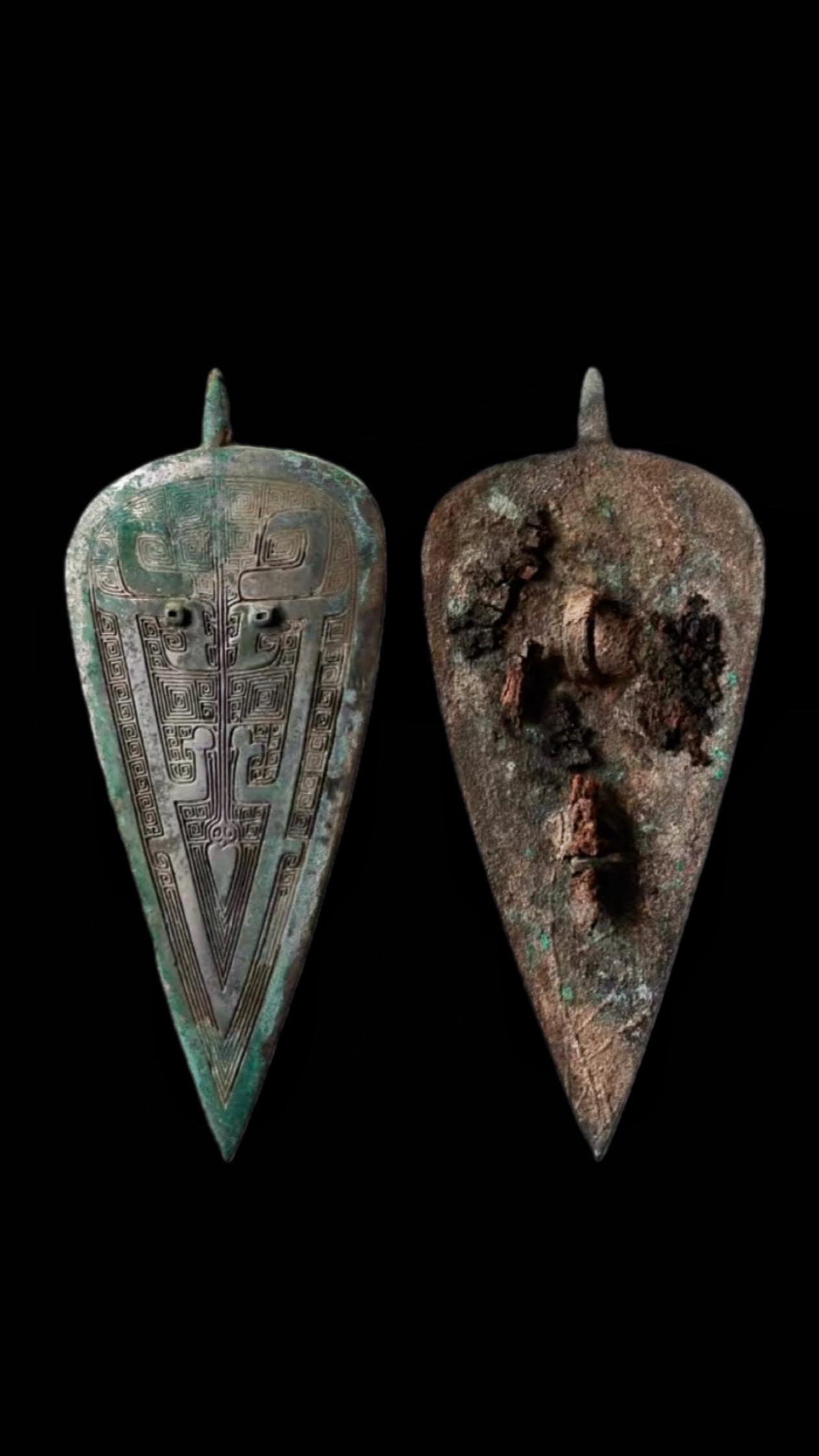商代·衡末饰。幡幡瓠叶,采之亨之 君子有酒,酌言尝之 ——先秦《诗经· 小雅·鱼藻之什·瓠hù叶》 长15.8厘米,与之前发的八角星嵌松石衡中饰同出土于陕西省清涧县寨沟遗址 墓主可能为鬼方首领,年代约为殷墟三期 此类三角形衡末饰至西周已完全消失