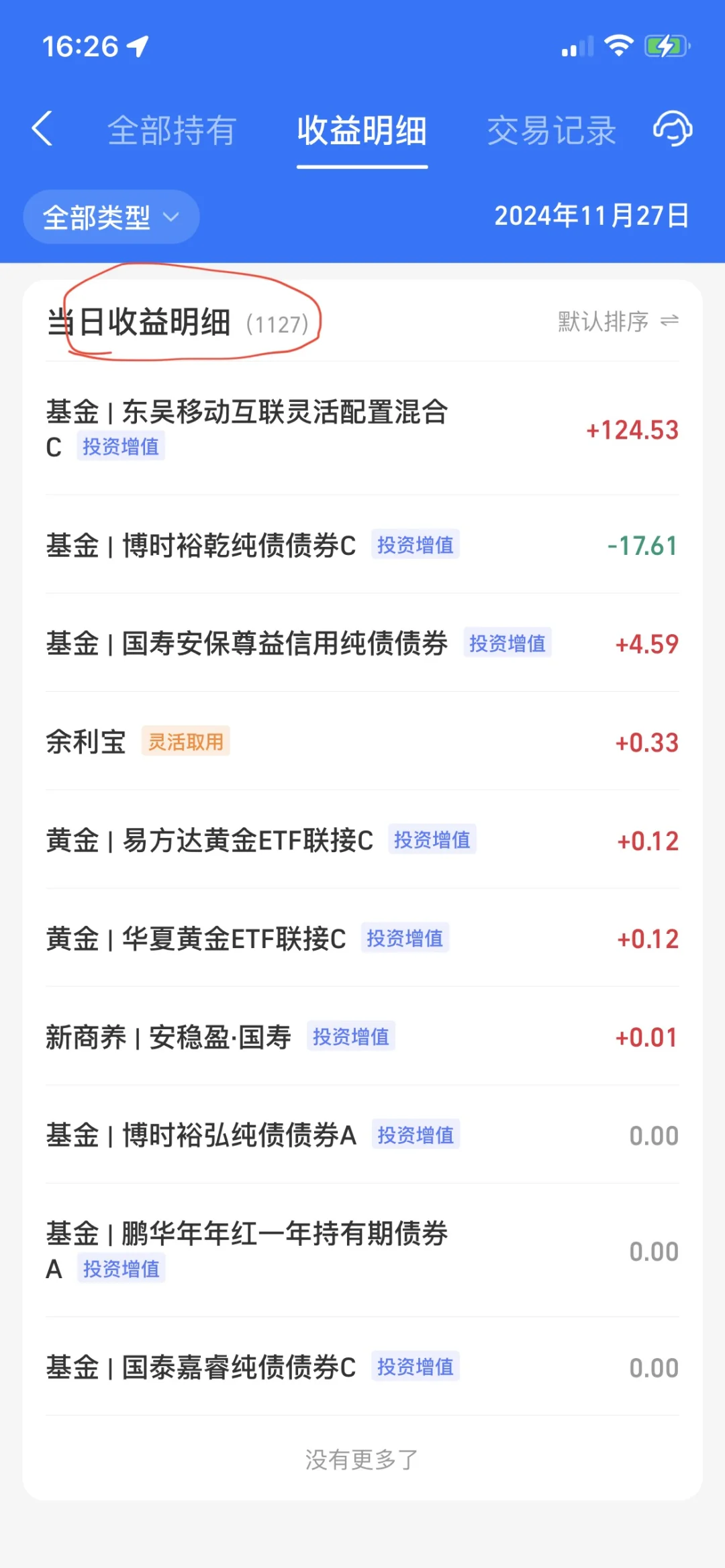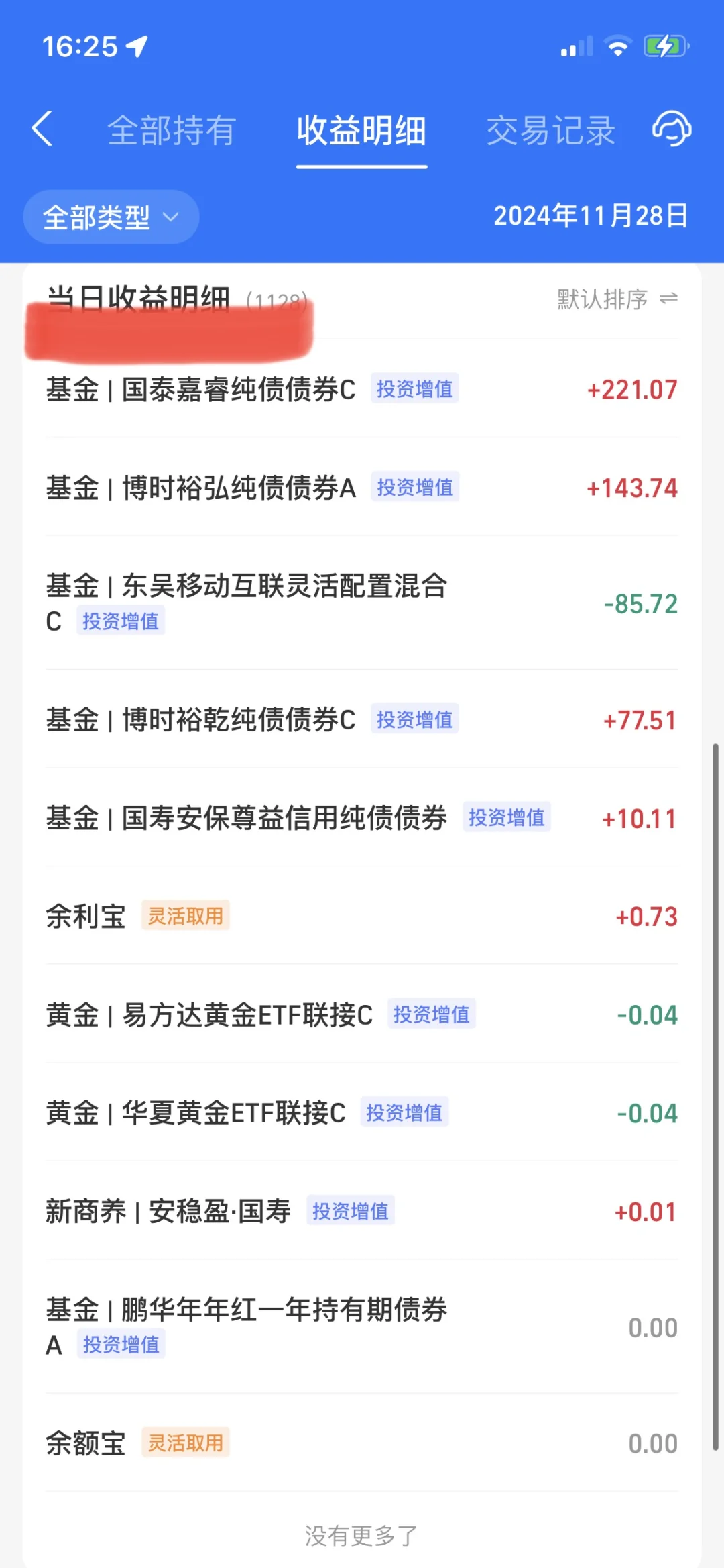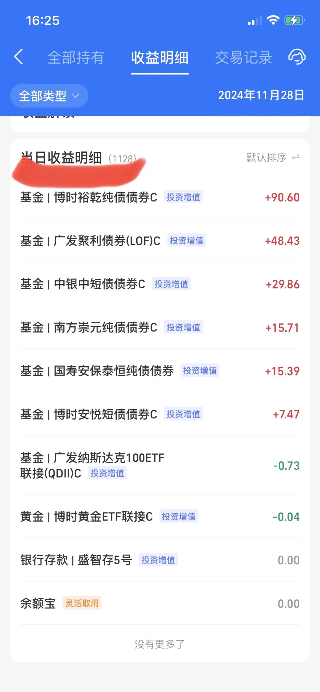 我的理财日记 存钱打卡 昨天出了一个小事故,一直在处理, 把两天的收益更新下,最近真的好不错, 前天3点前清了部分利率,想加点信用, 因为有10元红包,就想加点长城稳健, 最近观察了一下,感觉比较平稳了, 但是由于中午同事说要请我们吃蛋糕, 火急火燎的马上定了一束花给她, 忙呀忙,3点前又忘记了, 下周再想想加什么吧, 提前减仓有点难过,今天又是涨涨的一晚, 没有百分百的准确加仓,只要收益是正的就好, 期待下今晚的收益,11月就完美结束啦~