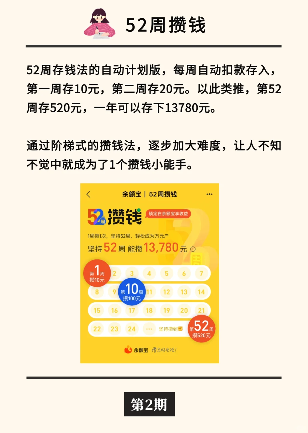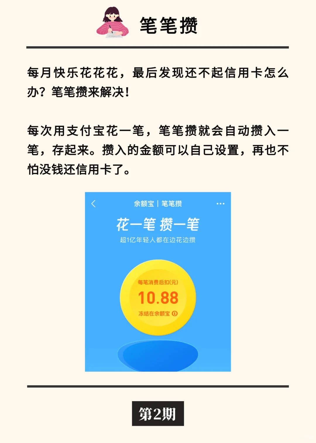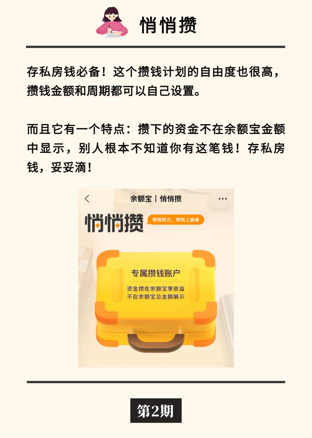 工欲善其事,必先利其器。想要好好存钱,必然需要称手的存钱工具。 今天依依就来介绍支付宝上的5个隐藏的存钱工具,让我们边存边赚💰 1️⃣52周攒钱法:一周存一点,一年下来能攒不少 2️⃣笔笔攒:每次消费,自动帮你存一点 3️⃣蚂蚁星愿:设定个目标,一点一点攒 4️⃣小荷包:和朋友一起存,旅行或者聚餐时用 5️⃣悄悄攒:悄无声息地帮你存钱