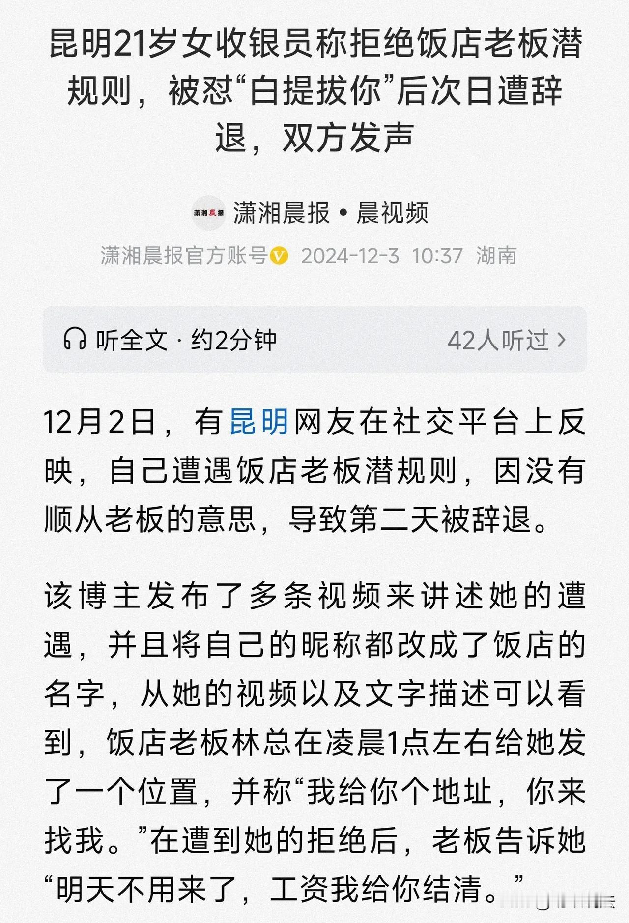 云南,一个21岁的女子,入职了昆明某川菜体验馆,岗位为服务员,但不久之后,饭店将她调整到前台收银。没想到,这竟是老板想要“潜规则”她!女子果断拒绝的当晚,老板就给她发信息,“白提拔你了,明天不用来了,工资我给你结清!” (来源:潇湘晨报•晨视频) 今年21岁的温乐心,出生在一个普通的农村家庭,她怎么也没有想到,饭店把她调整到前台收银岗位,竟然是因为老板想要潜规则她! 温乐心(化名)因为家庭条件有限,没有读大学,早早地踏入社会,虽然年龄不大,但三观很正,也很能吃苦。 11月11日,温乐心到昆明一家生意还不错的川菜体验馆入职,岗位为当服务员,因为其个人形象不错,没过几天,饭店就将她调整到前台收银。 在温乐心看来,这是因为她细心、踏实,饭店的老板认可她,才让她到前台收银。直到员工团建,温乐心才知道老板怀着龌龊的心思。 几天前,饭店老板林某组织员工团建,温乐心作为新员工,参加了本次活动,当天晚上,大家用餐到深夜。 温乐在聚餐快要结束的时候,提出想要离开,谁知林某看到,竟以谈工作为由,让温乐心等他一会。 温乐心社会经验少,真以为是工作上的事情,又因为太晚了,多次询问林某是不是有工作要安排? 林某没有答复温乐心,直到聚餐结束,其他人都走了,林某搭了温乐心的手臂,有所行动。 好在温乐心察觉情况不对,坚持要自己骑车回家,然而林某不死心,临走前再次询问温乐心:“你确定不和我走吗?” 等温乐心到家后,林某又给温乐心发了一个住址,要温乐心到某公寓找他! 遭到温乐心婉拒后,林某生气了,口头上称“没事,那就算了,就算我白提拔你。” 见温乐心迟迟不回信息,林某知道自己的计划落空,给温乐心发信息说,“明天不用来了,工资我给你结清。” 1、林某想做什么,是司马昭之心,路人皆知。 但这事只要林某没有用强,没有胁迫温乐心,或者借温乐心喝了酒,做一些禽兽行为,法律就不会管,留给道德评价。 因为法律只是最低的道德标准,一个根本没有违法的人,照样可能是个人 渣! 而且这也叫提拔?一个集团酒店的老板提拔个经理,还可以算提拔,一个饭店提拔了个收银员,林某真敢想! 2、林某让温乐心明天不用来了,属于违法解除劳动合同。 《劳动合同法》第八十七条,用人单位违反本法规定解除或者终止劳动合同的,应当依照本法第四十七条规定的经济补偿标准的二倍向劳动者支付赔偿金。 事发之时,温乐心已在饭店上了大半个月的班,按照法律规定,饭店不仅要结清她的工资,还要赔偿她一个月的工资! 有网友提出,现在饭店也有试用期,温乐心到饭店的时间不到一个月,试用期都还没满。 试用期是公司试用员工的时间段,员工在这期间千万别嘚瑟,因为老板可以随时开除你,且不需要理由。是这样吗? 当然不是,《劳动合同法》第39条规定,劳动者在试用期间被证明不符合录用条件,或者严重违反用人单位的规章制度的,用人单位可以解除劳动合同。 也就是说,要开除试用期的员工,也需要该员工不符合录用条件,或者员工严重违反了用人单位的规章制度。 3、除了可以让饭店支付违法解除劳动合同赔偿金外,温乐心还可以要求继续履行合同,获得更多的赔偿,恶心林某! 关于违法解除的后果,《劳动合同法》第四十八条规定: 用人单位违反本法规定解除或者终止劳动合同,劳动者要求继续履行劳动合同的,用人单位应当继续履行;劳动者不要求继续履行劳动合同或者劳动合同已经不能继续履行的,用人单位应当依照本法第八十七条规定支付赔偿金(双倍赔偿)。 这一条的意思是,饭店违法解除劳动合同,作为劳动者的温乐心可以选择让饭店支付赔偿金,也可以选择回到饭店继续上班。 有网友表示不解,选择继续回饭店上班,怎么可以获得更多的赔偿呢? 这是因为选择继续回饭店上班,可以诉请法院判令饭店支付违法解除到法院判决继续履行劳动合同这期间的工资! 大家都知道,一旦打起官司来,时间至少要几个月,按照法律规定,饭店需要支付温乐心这期间的工资。 对此,您怎么看? 关注@蚂蚁说法 关注时事新闻和法律