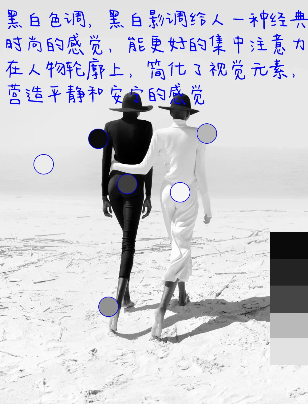 [四R].黑白色调,黑白影调给人一种经典时尚的感觉,能更好的集中注意力集中在人物轮廓上,简化了视觉元素,营造平静和安宁的感觉