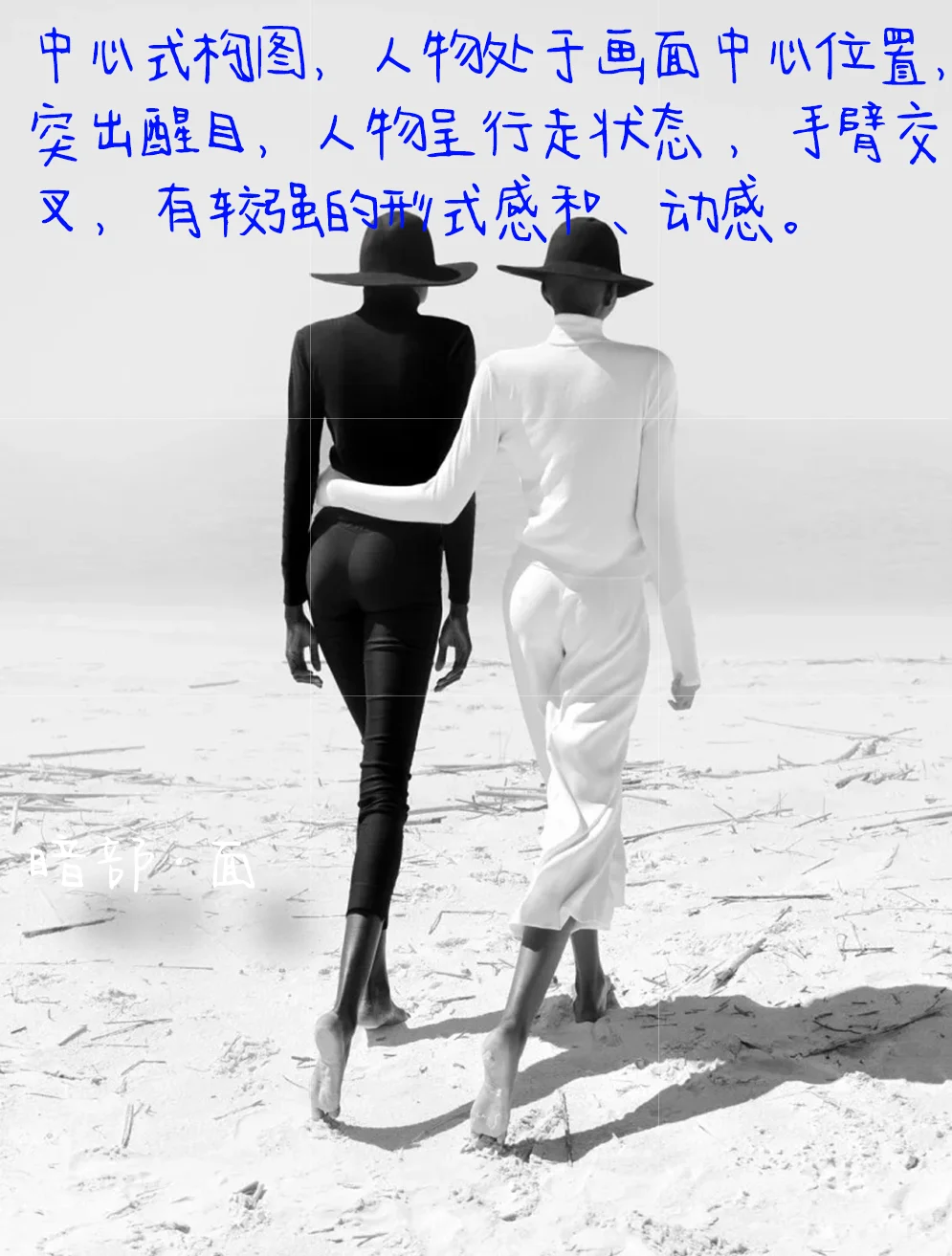 [一R]中心式构图,人物处于画面中心位置,突出醒目,人物呈行走状态,手臂交叉,有较强的形式感和、动感。