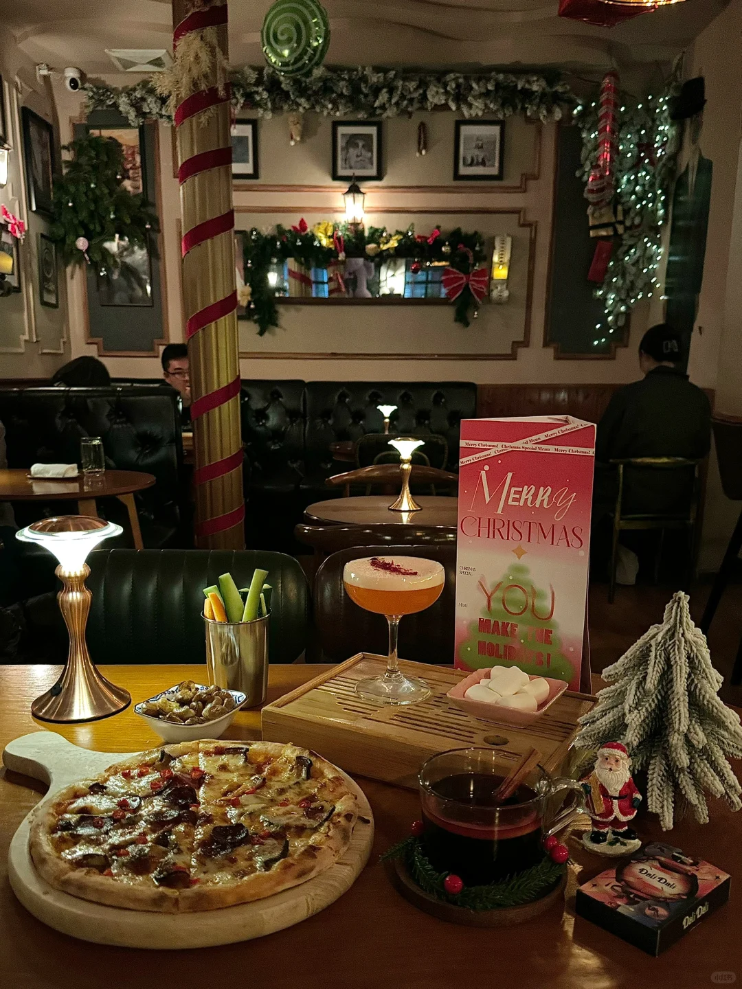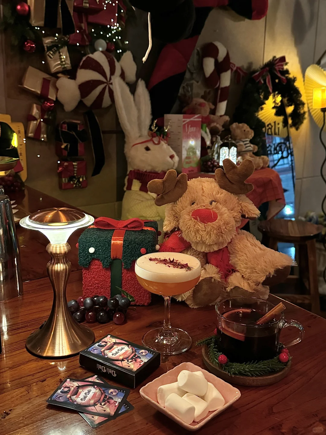 不得不说北京真的遥遥领先!!! 北锣鼓巷胡同里的bar已经开始圣诞预热啦🥂 这次圣诞布置真的很用心😇 酒单上也多了好几款圣诞特调🆕 暗调灯光+超有品味的音乐氛围感拉满 桂花热红酒真的太适合最近的天气啦🍷 喝完整个人都暖暖的☺️ 本人每次必点爱丽丝梦游仙境🎀 颜值和味道都拿得出手👍🏻 喜欢酸甜口味的友友一定要试试! 据说花园店有一个倒挂的圣诞树🎄 Dali真的太有创意了叭!
