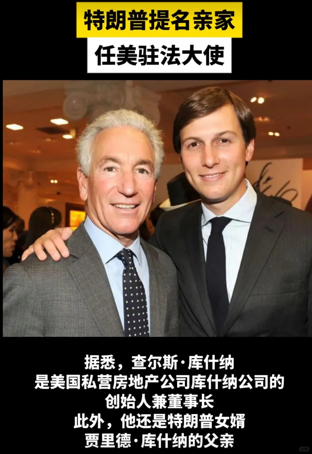 川普总统将提名新泽西州地产大亨Charles Kushner担任美国驻法国大使.川普总统表示,查尔斯·库什纳是一位出色的商业领袖、慈善家和交易员,他将成为代表美国及其利益的坚定倡导者。 据悉,查尔斯·库什纳是美国私营房地产公司库什纳公司的创始人兼董事长.此外,他还是川普总统女婿贾里德·库什纳的父亲.😝😍