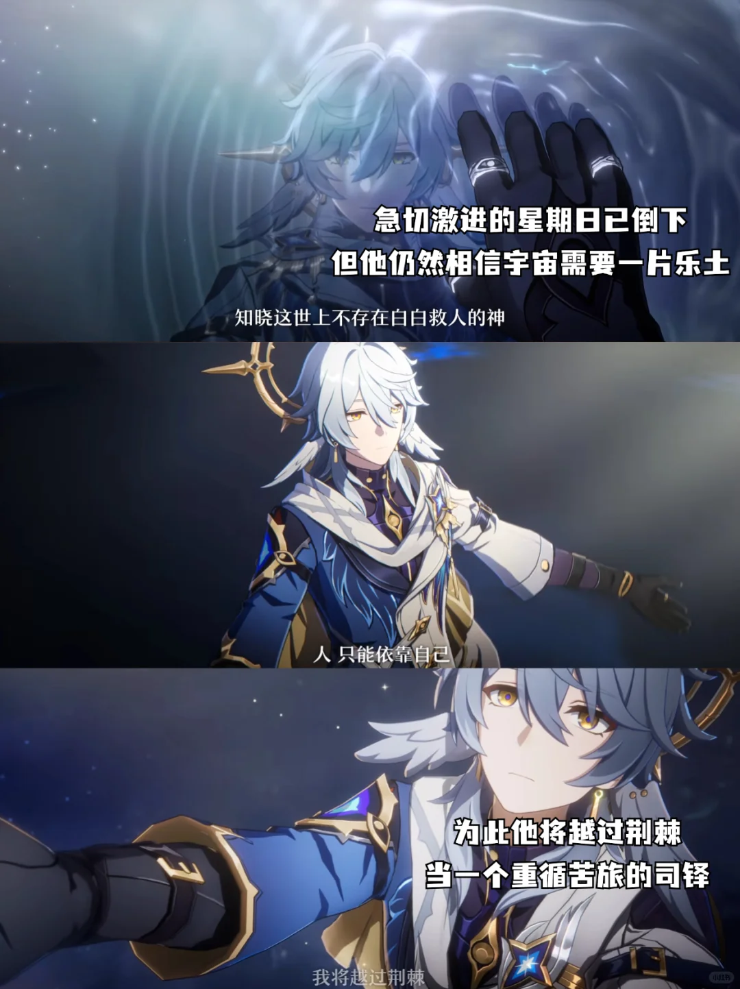 这个pv的名字叫独奏者,但却是两个星期日的斗乐 进一步阐释了星期日的自我斗争及和解 原来那身衣服的星期日急切激进趋于掌控 换了一身衣服的星期日平和冷静释然 急切激进的星期日已经倒下 但平和冷静释然的星期日仍然相信宇宙需要一片乐土 为此他愿意越过荆棘,即使触及它前会坠毁也要循此苦旅,终抵繁星 将星期日的理念更加完整充分地展示出来,他的理想更加人性化了而不是像之前让所有人沉睡那样神性化难以理解