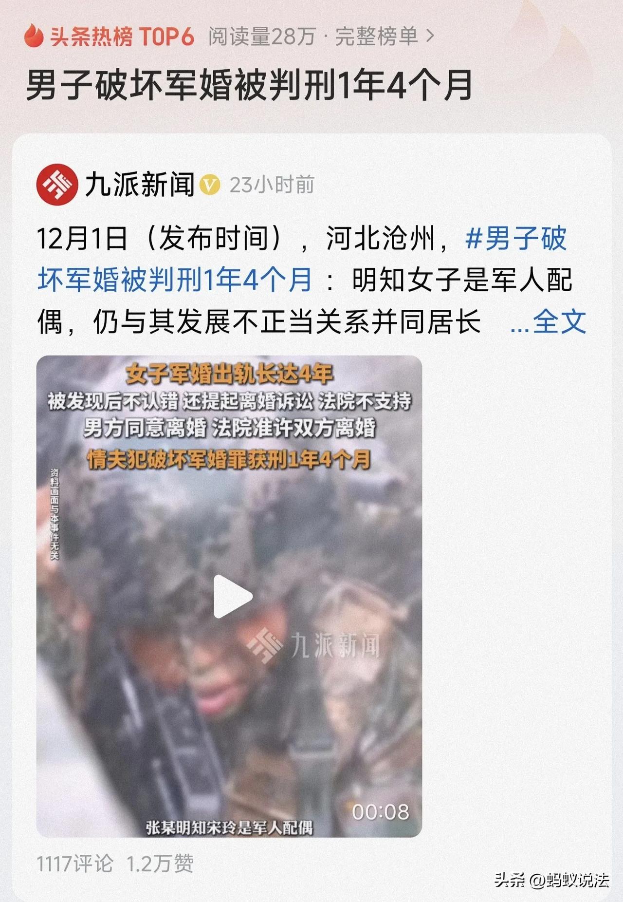 判得太轻了!河北沧州,一军人和妻子结婚后,每次探亲都急切地往家里跑,并因为探亲时间短,常年分居,对妻子很是愧疚。没想到,妻子在家期间,竟和一工程师发展成了情人关系。军人发现后,悲痛欲绝,妻子见状,却毫不留恋的提出离婚!法院:该工程师构成破坏军婚罪,判处有期徒刑一年四个月。 (来源:九派新闻) 早晨的天刚亮,吴皓华就拿着行李,踏上了返回部队的列车,婚礼的热闹和妻子的笑颜,仿佛已经是很远的事情。 吴皓华(化名)是一名军人,这是他当兵入伍的第三年,一想到妻子愿意等他,愿意和他在一起,吴皓华内心都会升起一股暖流,非常感动。 只是戎装在身,身不由己。 看着妻子眼泪夺眶而出,吴皓华轻轻为她拭去泪水,紧紧握住她的手,仿佛在说:“等会我退伍回来,我们再不分离。” 因工作需要,吴皓华仍需留在部队,每年只能回家探亲一次,而每年探亲的日子,成了吴皓华最期待的时光。 回家的前夜,吴皓华会期待着妻子的惊喜,甚至会失眠、兴奋,然而到了结婚的第五年,妻子宋女士变了。 这一年,宋女士认识了一个叫张某的人,对方的职业是工程师,中等身材,略微发福,但步履依旧稳健。 或许是长期与机器和图纸打交道,他的手指粗糙而有力,布满了老茧。 如果只是正常的往来,倒也没有后续的事情,可不知道怎么的,宋女士被张某吸引,两人在后来的一天,突破了限制,成为情人关系。 吴皓华当兵的第十年回家探亲,发现妻子行为有点不对劲,老是偷偷摸摸往外跑,接个电话都要躲着,心里起了疑心。 经过一段时间的观察,吴皓华发现了妻子和张某的事情,内心一阵绞痛。 他都想好了退伍之后,和妻子再也不分开,可妻子呢,竟然背叛了他,背叛了他们的爱情。 更让吴皓华没想到的是,妻子不仅不认为她错了,反而觉得她和张某之间才是爱情,和吴皓华已经没有感情了,主动向法院提起离婚诉讼。 1、宋女士提起离婚,法院会准予吗? 《民法典》第108规定,现役军人的配偶要求离婚,应当征得军人同意,但是军人一方有重大过错的除外。 与军人离婚,不是你想离就那么容易离的。一般婚姻离婚时以“感情破裂”为标准,但军人配偶要求离婚需以“重大过错”为标准,这样规定,是为了维护军队稳定的需要。 吴皓华和宋女士的这段婚姻中,不忠的人是宋女士,不是吴皓华,所以如果吴皓华不同意离婚的话,宋女士是不可能成功离婚的。 但吴皓华拿得起,放得下,既然宋女士不想过了,他也不纠缠对方,同意了离婚。 2、张某构成破坏军婚罪,没有争议,但宋女士呢,宋女士是否构成破坏军婚罪? 破坏军婚罪是《刑法》第259条规定的罪名,是指明知是现役军人的配偶而与之同居或者结婚的行为。 这一条规定了两点: 第一,要求张某在确切知道宋女士是现役军人的配偶的情况下,仍然与之同居或者结婚,才构成本罪。 如果张某不知道宋女士是现役军人的配偶,或者是受欺骗而与现役军人的配偶同居或者结婚的,不构成本罪。 张某知道宋女士是现役军人的配偶吗? 答案是知道,张某不仅知道,还和宋女士同居长达4年之久,所以法院以破坏军婚罪,判了张某有期徒刑一年四个月。 第二,军人配偶不是破坏军婚罪的主体。 具体到本案,宋女士和张某保持不正当关系,只有张某构成破坏军婚罪,宋女士不构成。 对此,有网友说,“判得太轻了,建议5年起步! 女方也应该同罪,你享受军婚权利更要尽义务!” 一个叫“吖丸子吖”的网友表示,“其实我很适合嫁给兵哥哥,因为我喜欢一个人独处,想简单点,孩子能带,也能接受跟婆婆住一起,老公之类的,对我来说意义不太大,不黏人。” “从谈恋爱到结婚生子,我都是跟我老公分开的,没啥苦恼,反而他在面前,觉得空气都不新鲜了!” 关注@蚂蚁说法 男子破坏军婚被判刑1年4个月 关注时事新闻和法律