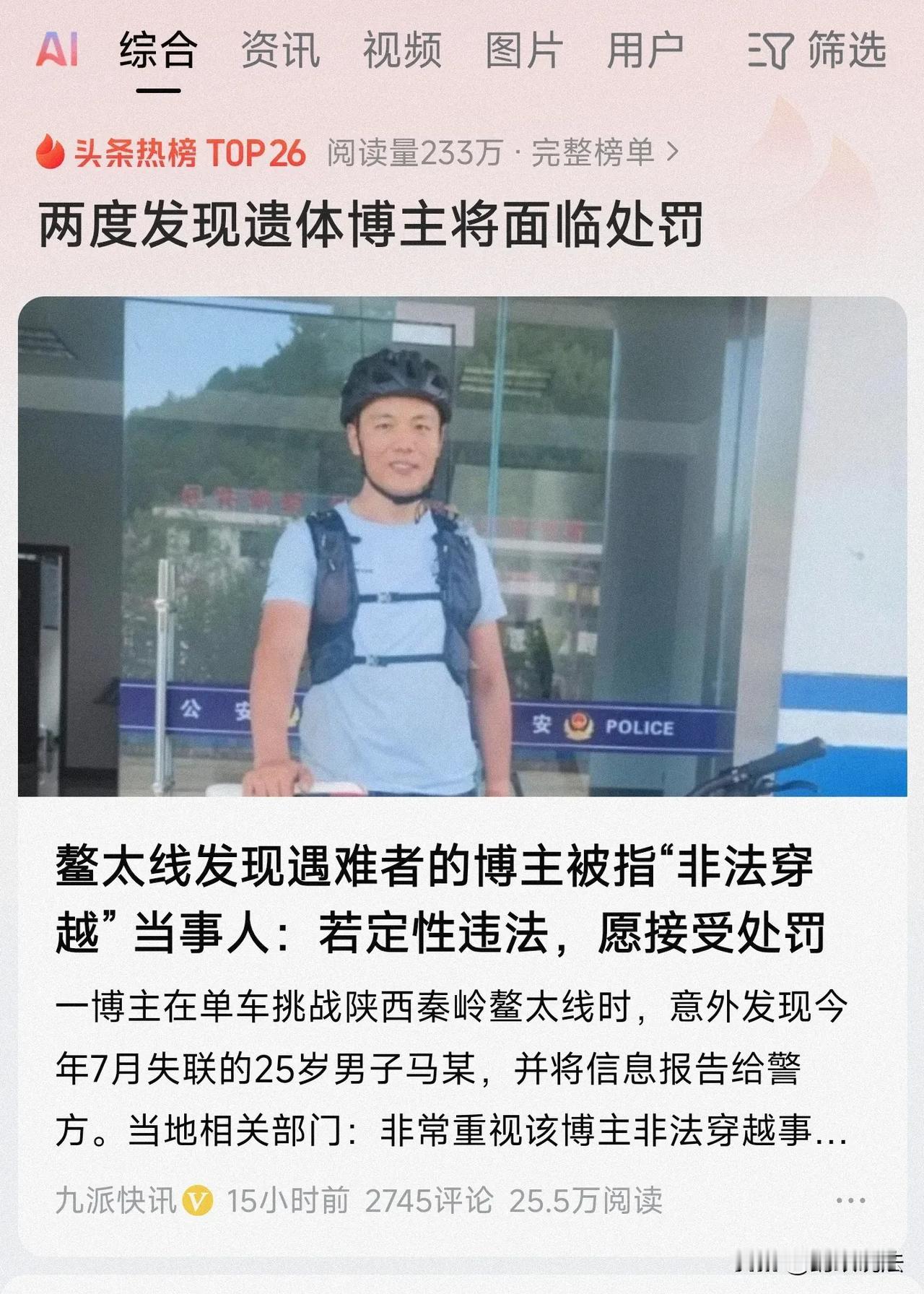 陕西,一男子在太白山看到当地警方发布的一份人口失踪协查通报,觉得自己有义务配合警方,后来,他在山上发现了遇难者,理所应当报了警。万万没想到,有关部门竟讨论要不要认定男子“非法穿越”,进而对其进行处罚。 (来源:九派快讯) 发现遇难者的博主有个很大气的网名,叫“猛龙过江”。猛某表示,他看到有关部门讨论要不要认定他为“非法穿越”时,感到很震惊。 猛某说,大约半个月前,某有关部门就曾联系过他,希望他删除相关视频,但他当时以为是遇到电信诈骗,没有当真。 猛某介绍,当时他骑车去太白山苗圃玩,看到当地警方发布的一份人口失踪协查通报,作为一个遵纪守法的公民,猛某当即觉得,他有义务配合警方。 后来,猛某在太原崛围山天坑附近,意外发现一名疑似4年前的遇难者,便理所应当报了警。 而这是猛某第二次发现遇难者了,第一次是骑行穿越“鳌太线”,并在帐篷内发现遇难者遗体的户外博主。 1、配合公安机关执行职务,是每个公民应尽的义务。 《人民警察法》第三十四条,人民警察依法执行职务,公民和组织应当给予支持和协助。公民和组织协助人民警察依法执行职务的行为受法律保护。对协助人民警察执行职务有显著成绩的,给予表彰和奖励。 猛某看到当地警方发布的一份人口失踪协查通报,配合警方的工作,是应该的,也是猛某作为一个公民的义务。 2、猛某的行为,应该怎么定性?是否违法? 首先,“非法穿越”说的是未经批准进入自然保护区,穿越保护区,这属于违法行为。 《自然区保护条例》第三十四条,违反本条例规定,有下列行为之一的单位和个人,由自然保护区管理机构责令其改正,并可以根据不同情节处以100元以上5000元以下的罚款: (二)未经批准进入自然保护区或者在自然保护区内不服从管理机构管理。 按照本条例规定,非法穿越的,可以处以100-500元罚款。 其次,有关部门曾发布公告,根据《自然保护区条例》等相关法律法规,“鳌太线”“龙洞沟、将军石至太白山线”是陕西太白山国家级自然保护区核心区, 禁止一切单位或个人随意进入开展非法穿越活动。 《陕西省旅游条例》第六十七条:在没有道路通行的地方或者旅游景区游览路线以外的地方,组织开展穿越山岭、攀登山峰等具有危险性的健身探险旅游活动,组织者应当向参与者作出风险提示,并应当提前五日将活动时间、地点、路线、人员名单、保障措施、应急方案等向县级以上体育行政部门备案。地点、路线涉及军事设施保护区、自然保护区以及旅游景区的,依照相关法律、法规规定执行。 在非景区游览,需要向有关部门备案,且要遵守相关的法律、法规,比如前面说的“鳌太线”禁止非法穿越。 现在的问题是,猛某配合了警方的工作,又违法了,这要怎么办? 一种意见认为,鳌太线只要不涉及国家机密,挑战大自然,不断超越自我,这种精神应该值得提倡,大好山河,俊秀风光,应该被更多的人欣赏,一纸禁令就管控了,这是不作为,懒政的体现。 另一种意见认为,难怪前面的人看到了也不报警,原来报警要被处罚,以后少做好人,视而不见的好。 还有人说,要较真那就较真到底,处罚完了,见义勇为,协助警方的奖是不是也要搞一下? 比如先罚非法穿越,再奖励报警发现遗体,最后重申此地危险,禁止穿越,并改善机制和设施! 关注@蚂蚁说法 两度发现遗体博主将面临处罚 关注时事新闻和法律