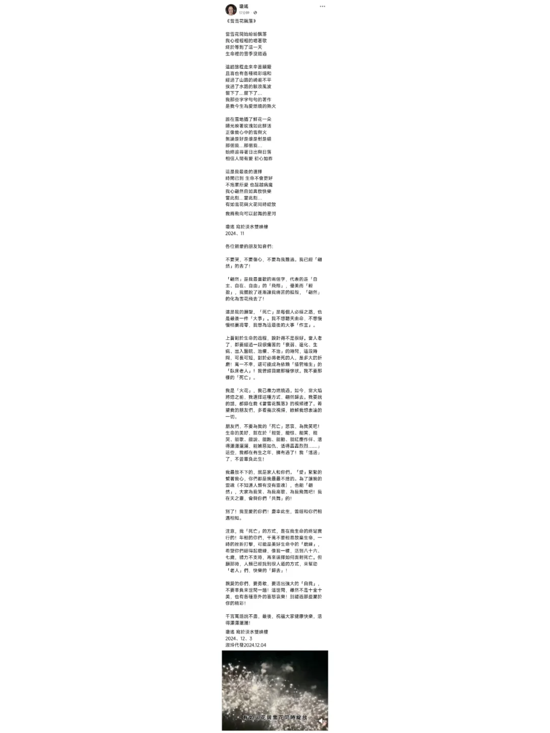 她的社媒更新了一则昨日写下的“遗书”:“不要哭,不要傷心,不要為我難過。我已經「翩然」的去了!「翩然」是我最喜歡的兩個字,代表的是「自主、自在、自由」的「飛翔」,優美而「轻盈」,我擺脫了逐漸讓我痛苦的軀殼,「翩然」的化為雪花飛去了!”