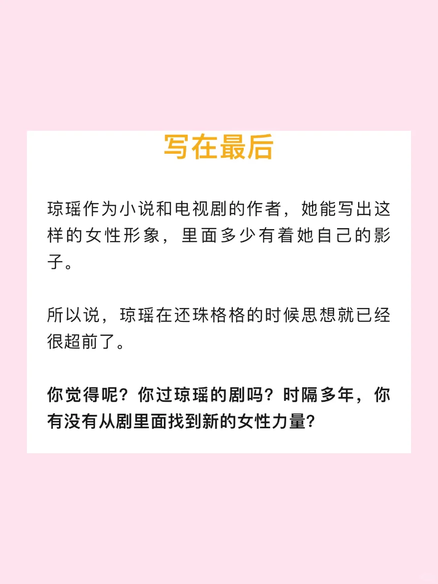 朋友往群里丢了张截图 心里猛地一震,太突然 而后就想起了青春期看琼瑶剧的时光 时隔多年才发现 琼瑶作为女性的精神状态 在很多年前的作品里 依稀能看到端倪 小燕子紫薇晴儿这些经典角色 或多或少都有女性觉醒的力量体现 - 时至今日 86岁的她选择主动离开这个世界 我突然发现她至今保持着主体性 选择不了来时的路 我可以选择离开的路