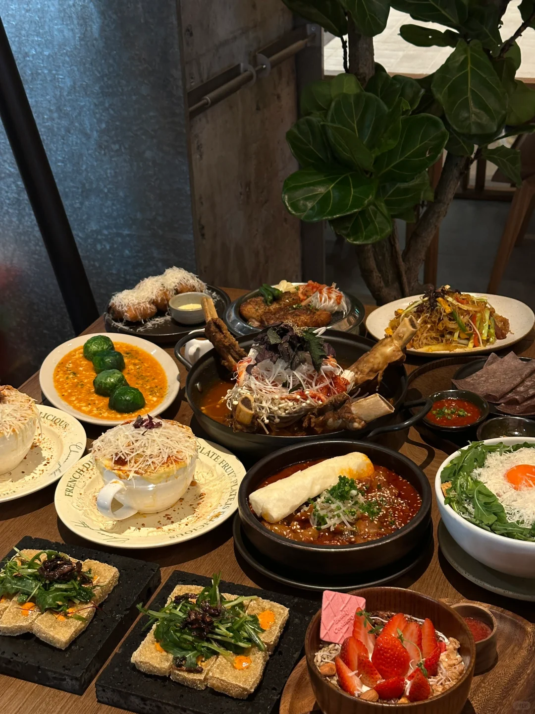 就在经开永旺!!一两句话说不清这家有多好吃!! 预测就将是下一个顶流排队王! 每道菜都好漂亮!颜控表示不能抵抗!! 抹茶甜甜圈现场手作,仪式感拉满!一口抹茶奶奶香香,好幸福❤️ 芝士泡菜焗意大利面,浓郁的芝士加上泡菜,微微辣,嗦起来很满足~ 鸡枞菌包浆豆腐,口感脆脆,好吃~ 还有热乎乎泡菜牛肋排锅、Q弹软糯的首尔无骨辣鸡爪….每个菜都好喜欢怎么办,我要NN刷!~
