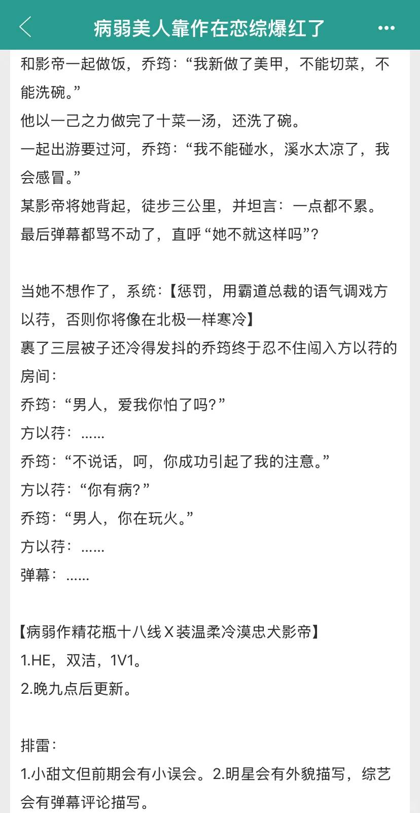节奏轻松明快,男女主感情很自然。真的很喜欢女主无限作,但做什么都有男主无底线答应的剧情。