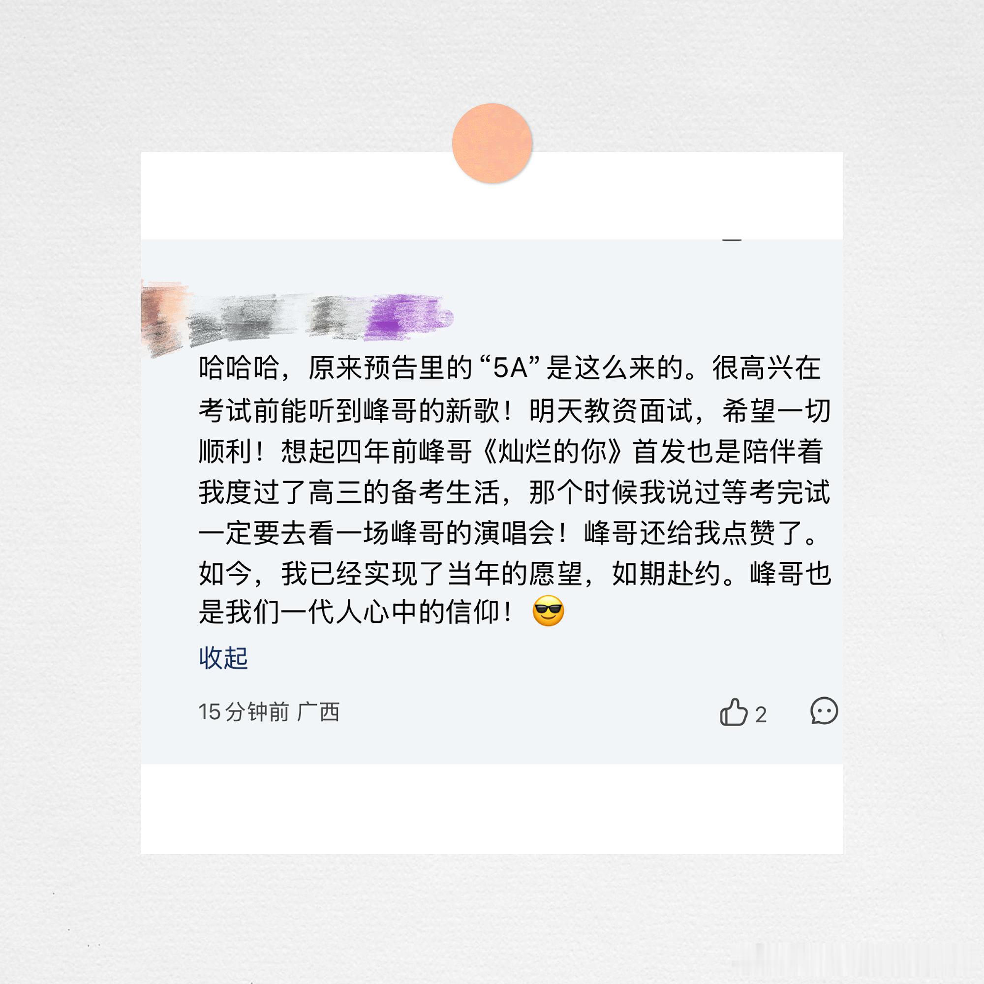 汪峰新歌里的5A破案了 激动人心的时刻到了!新专辑第一首单曲《一代人》正式上线!刚刚听完,整个人都还沉浸在那种震撼之中!预告里的“5A”梗也是破案啦,“哦诶哦诶”的旋律,如同天籁之音,让人心旷神怡,久久不能自已~这首歌仿佛是一面镜子,映照出每一代人的梦想与坚持,歌词深情而有力,直击人心。汪峰再次用他的音乐,触动了我们心底最柔软的部分。