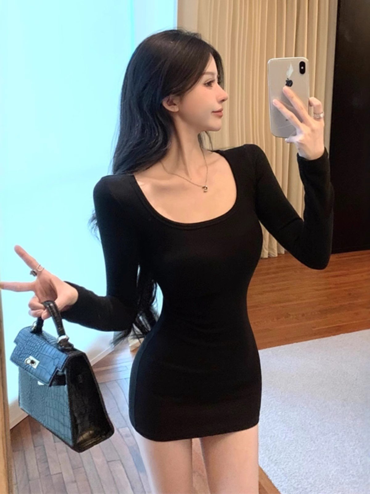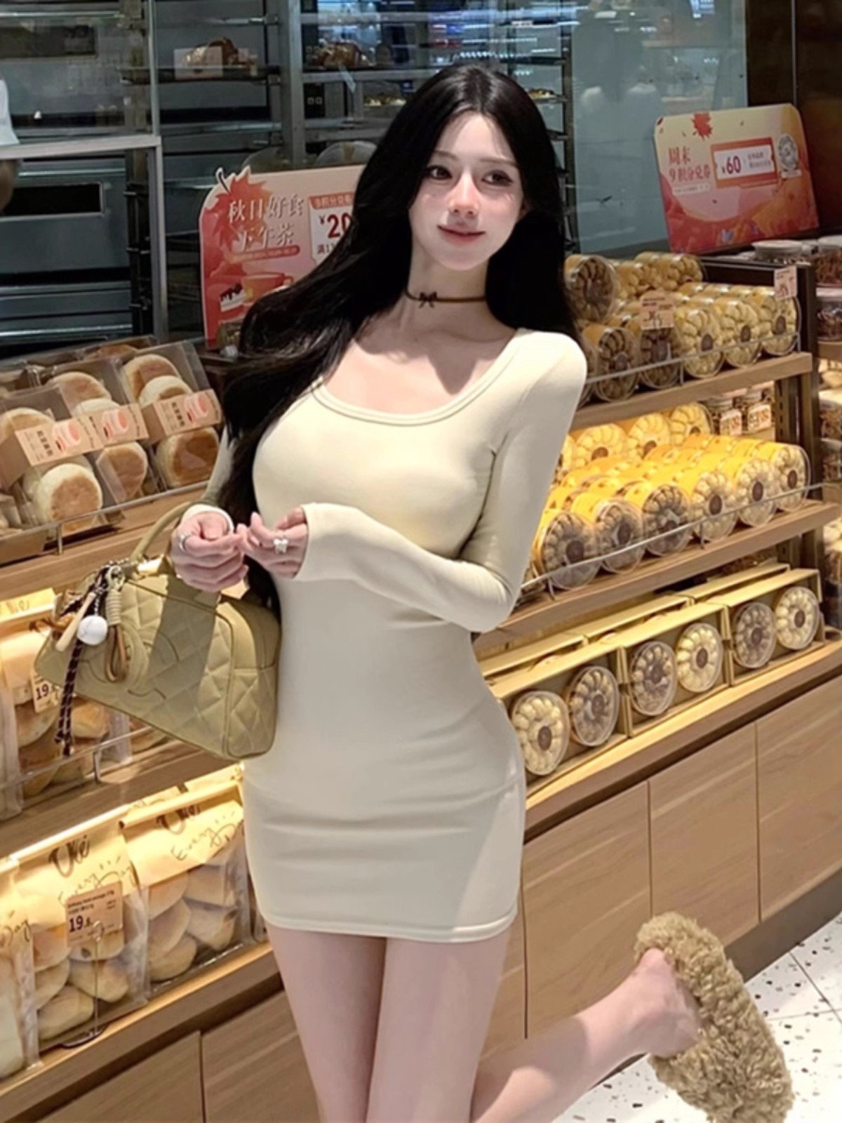 法式荡领露肩浅色针织内搭连衣裙女冬季高级