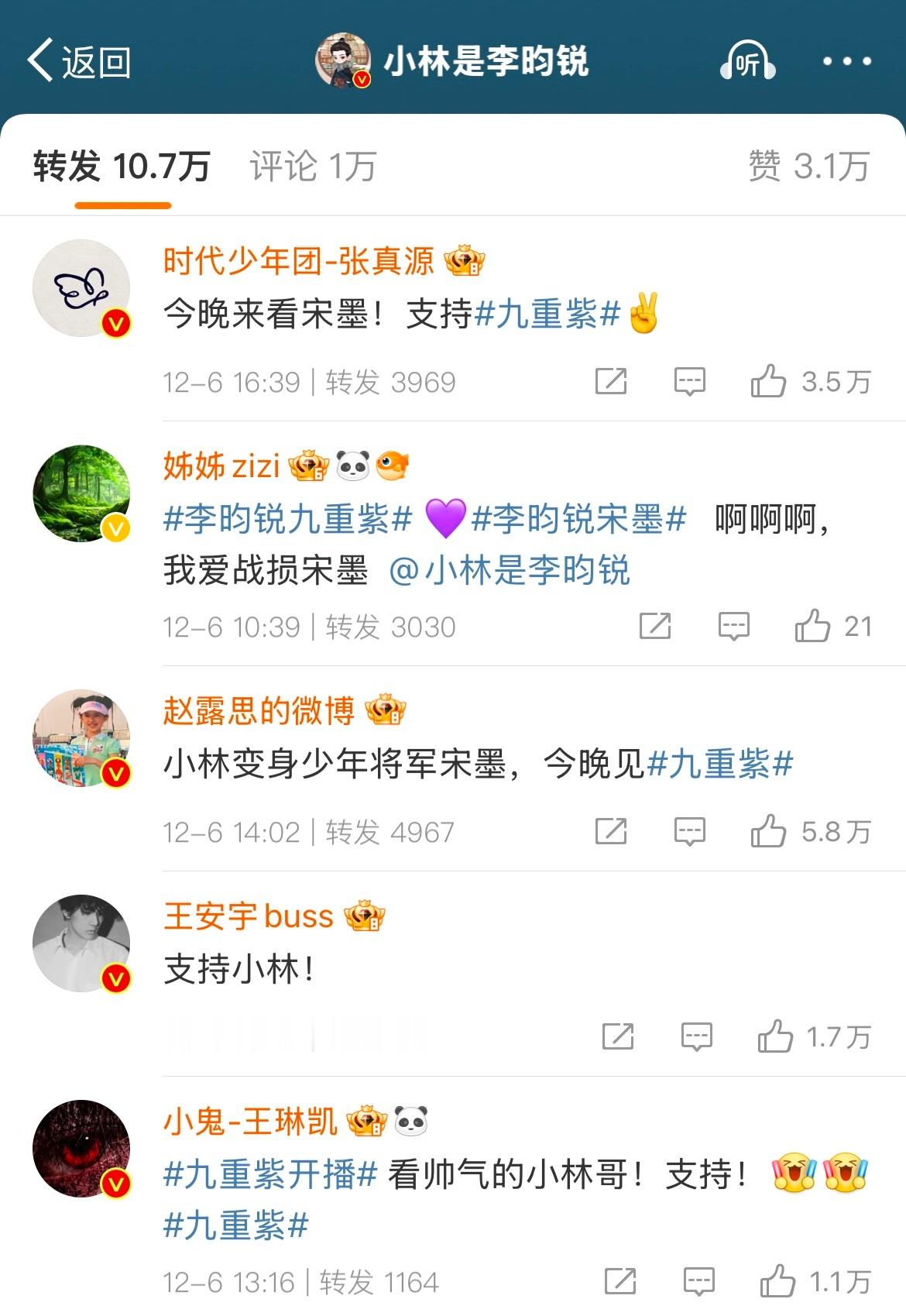 李昀锐摇来了好多人 小林这人脉也是可以的,真诚的小男孩一定值得被看到!就为了这个我多少也要看看们九重紫,期待值已经是给我拉的不能再满了已经[抓狂]我真的狠狠期待!这波是整个内娱都来看九重紫了吧🥺看预告已经氛围拉满了!我先看为敬!