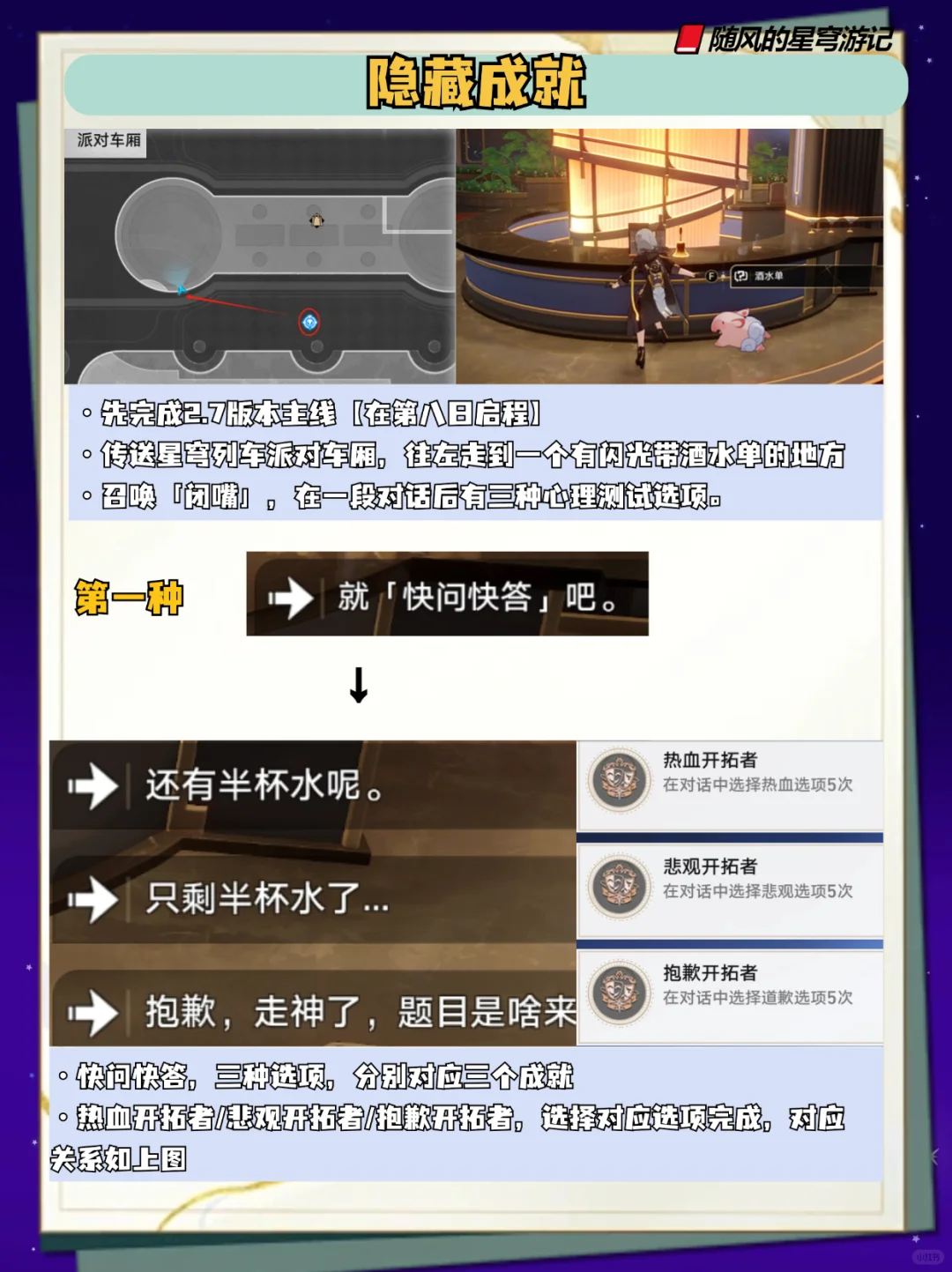 大家早上中午晚上好,我是随风 今天给大家带来的是6个开服就有对话的成就 有些选项你在主线不方便选,在这里就可以一次性完成啦 记得首先完成2.7版本主线才能去做,然后该位置是可以多次对话的