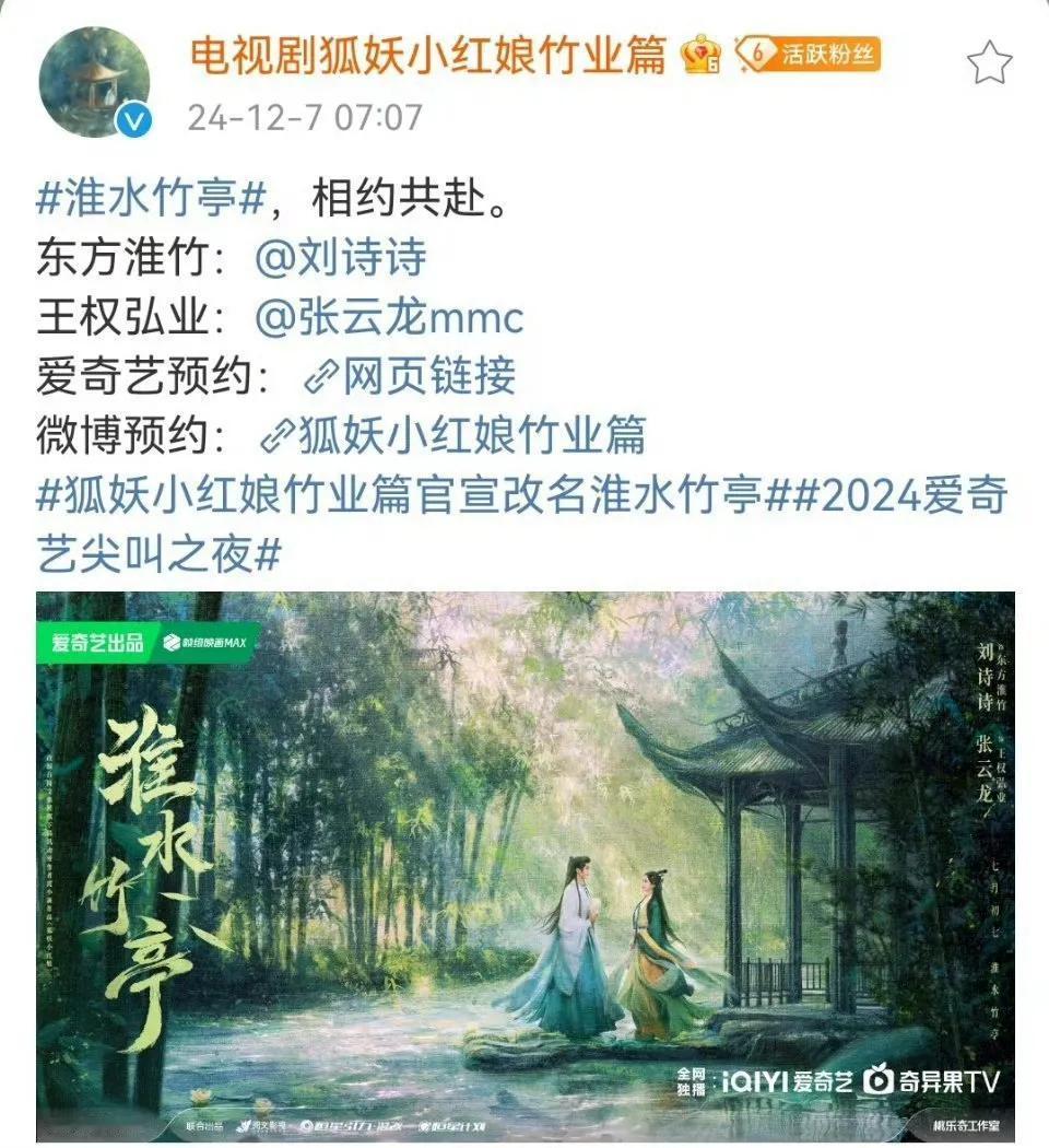 狐妖小红娘竹业 正式改名《淮水竹亭》,爱奇艺还改了简介 。