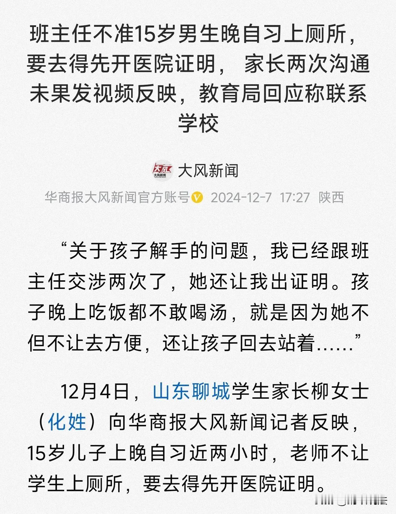 山东,一个15岁的学生上了1小时51分的晚自习后,憋不住了,给班主任老师说他想去上厕所,万万没想到,班主任不允许,还罚孩子站一节课。事发后,学生家长就学生晚自习上厕所,要到医院开证明一事,发视频质问学校,这种事情怎么能一刀切? (来源:大风新闻) 柳秀瑶儿子今年15岁,在聊城某重点高中读高一年级,其班主任是女教师,很年轻,还没结婚。 柳秀瑶(化名)本人是小学老师,同为教师职业,所以很理解儿子班主任的不容易。然而,因为儿子上厕所的事情,柳秀瑶和班主任交涉了两次,结果差点被对方气出病来! 柳秀瑶和班主任老师说,“晚自习两个小时不让上厕所,孩子憋的时间太长了。” 班主任老师反驳柳秀瑶说,“怎么别的孩子不去呀?” 柳秀瑶回复说,“每个孩子的身体情况不一样,有的可能撑的时间长一些,希望班主任老师理解一下。” 结果班主任老师让柳秀瑶去医院开证明,证明孩子1小时51分钟去上厕所,是因为身体有问题。 柳秀瑶很诧异,“这要开什么证明吗?”她问班主任老师,“去厕所能开什么证明?” 班主任老师回复说,“不跑操的就得有医院证明,这上厕所也得有证明。” 还说这是学校里的规定,学校不让去(厕所)。 柳秀瑶很无语,孩子这几天感冒,她交代孩子一定要多喝水,可因为班主任老师不让孩子上厕所,别说多喝水了,孩子晚上吃饭连汤都不敢喝了。 柳秀瑶表示,她认为班主任老师在针对自己孩子,坚持没去开证明,结果班主任老师又让孩子站了一节课,还在班里说,谁去厕所就得让家长开证明! 事发后,柳秀瑶拍了视频发网上,没想引起了很多家长的共鸣。 柳秀瑶说,“她想知道这是班主任的问题,还是学校管理的问题?” 柳秀瑶提出,“这样的证明谁能开出?即便开了也是证明家长很软弱,连孩子基本的解手问题都要开证明,都解决不了,那上这学干嘛?” 法律怎么看这事?班主任老师这样做合法吗? 《教育法》第二十九条规定,学校有按照章程自主管理的权利。 通俗地讲,法律规定了学校有自主管理权,学校有管理学生的权利。 上厕所是一项正常的生理需求,教育法没有规定孩子上厕所是否要请假,以及是否要开证明的问题。 但劳动法有相关的规定,劳动法认为劳动者在日常工作中“上厕所”是其必要的、合理的生理需求,与劳动者的正常工作密不可分,应当受到法律的保护。 成人如此,更别说还是未成年人的学生了! 学生是人,我们的教育是为了成全人、培养人、完善人,而不是把人变成考试的机器。 学校对学生进行管教,前提应是尊重学生的人格、身心和成长规律。 其次,《民法典》第一百一十条规定,自然人享有生命权、身体权、健康权、姓名权、肖像权、名誉权、荣誉权、隐私权、婚姻自主权等权利。 班主任老师利用管理学生的规则,不让上晚自习的学生上厕所,和民法典规定的生命权、健康权相冲突。 在这种情况下,班主任老师这样做合法吗? 学校的自主管理权是为实现学校的教育教学目的而设立的,学校的自主管理权不能超越教育教学管理的范围。 学校根据学校章程制定的教育教学管理措施,不能不合理地限制学生的个人身体健康权利,除非该种限制是教育教学管理所必须。 学校的自主管理权利与学生个人权利之间,需要有取舍和利弊权衡,该怎么取舍,还需要多说吗? 最后,学校按照学校章程的规定进行自主管理应该有边界,至于边界在哪里,目前尚没有明确的规定,至少不能侵犯学生的身体健康权。 这事还有一个小插曲,柳秀瑶说,她接到了有关部门工作人员的电话,对方说她不撤视频,就会立案调查。 柳秀瑶表示,“也许是吓唬我吧,意思是说有网友攻击到这个老师了,我说那不是我的问题,我还真不怕!” 对此,您怎么看? 关注@蚂蚁说法 关注时事新闻和法律