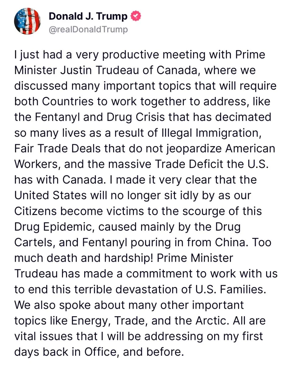 🚨突发新闻:特朗普总统刚刚宣布,特鲁多总理“承诺与我们合作,结束这场对美国家庭的可怕灾难”。
