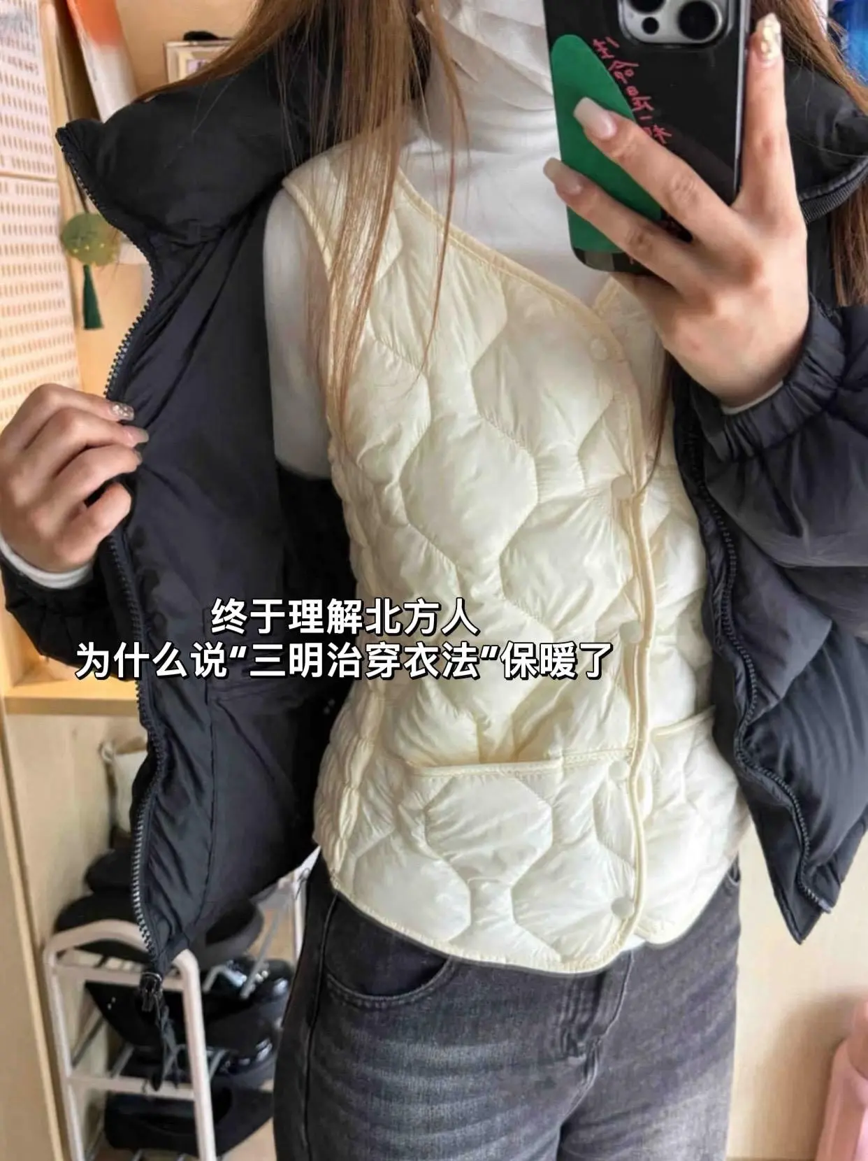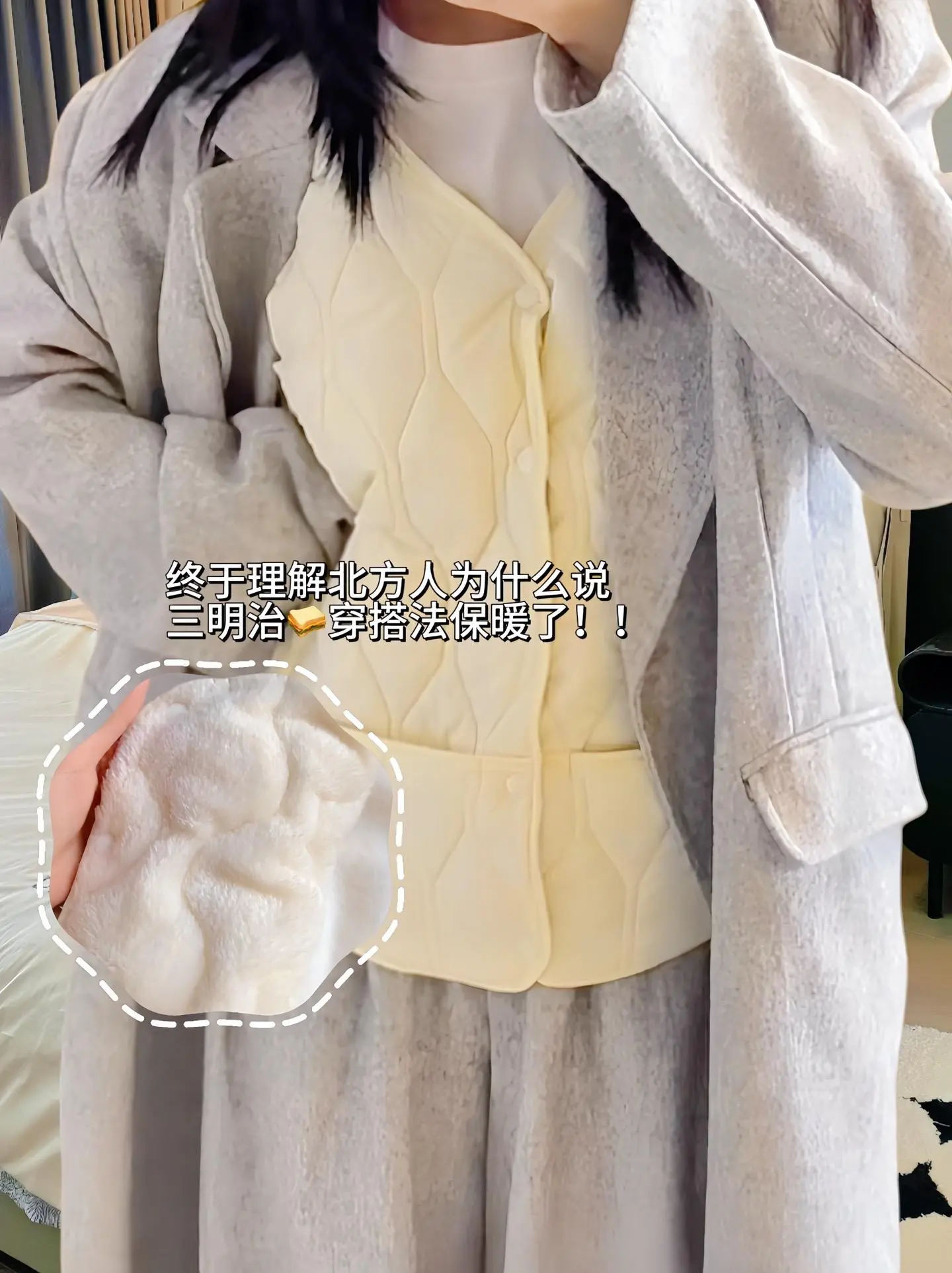 三明治穿衣法真的牛!啊啊南方小土豆的哈尔滨穿搭有着落了!这暖呼呼的加绒背心~穿起来热哭了~好暖和啊!太暖了以至于去年整个冬天都不想脱下来!我的冬天有它就够了!直接进太庙吧!简直就是怕冷星人冬天的御寒神器!内搭一件 也好好看!呜呜好完全不显臃肿~自带收腰还蛮显瘦的~