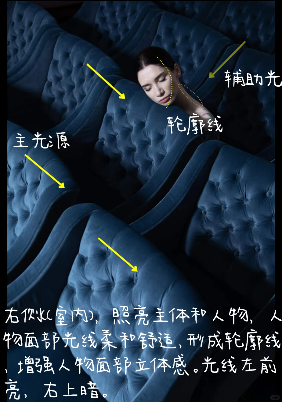 物面部光线柔和舒适,形成轮廓线,,增强人物面部立体感。光线左前亮,右上暗。