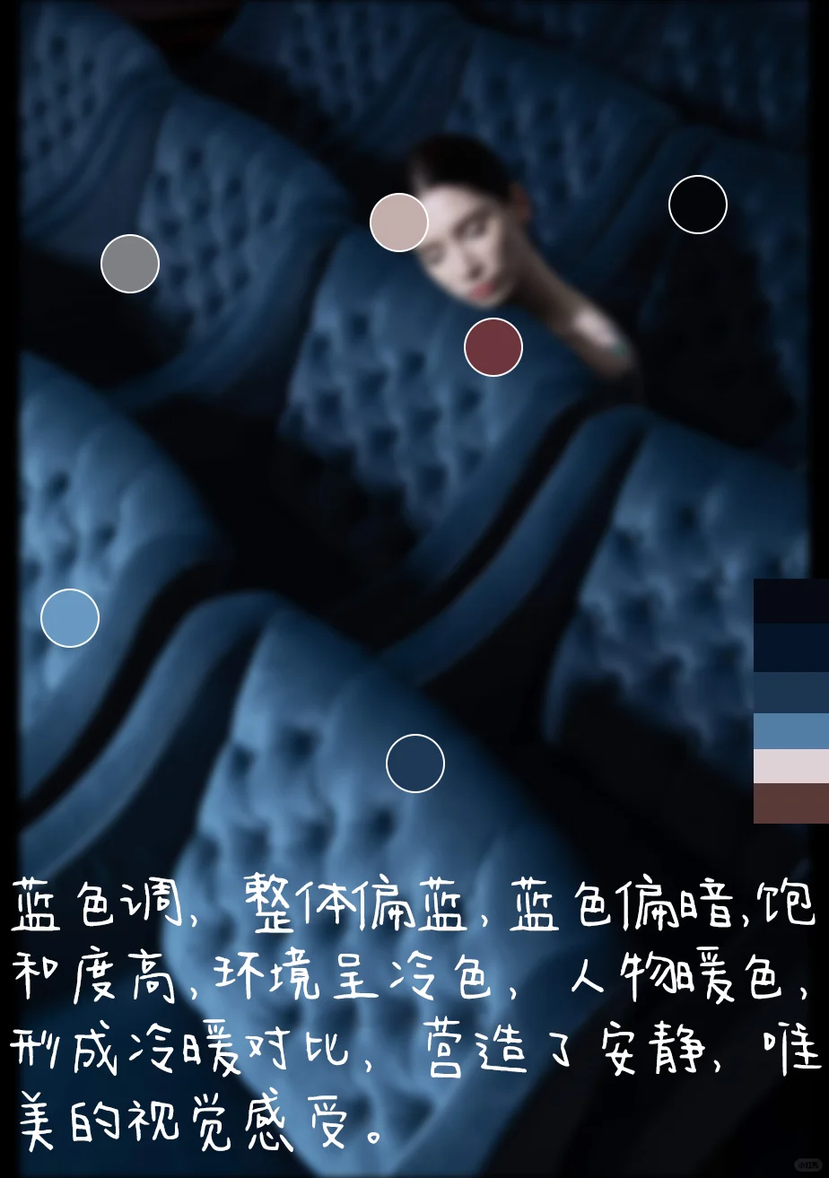 [四R].色彩:蓝色调,整体偏蓝,蓝色偏暗,饱和度高,环境呈冷色,人物暖色,形成冷暖对比,营造了安静,唯美的视觉感受。