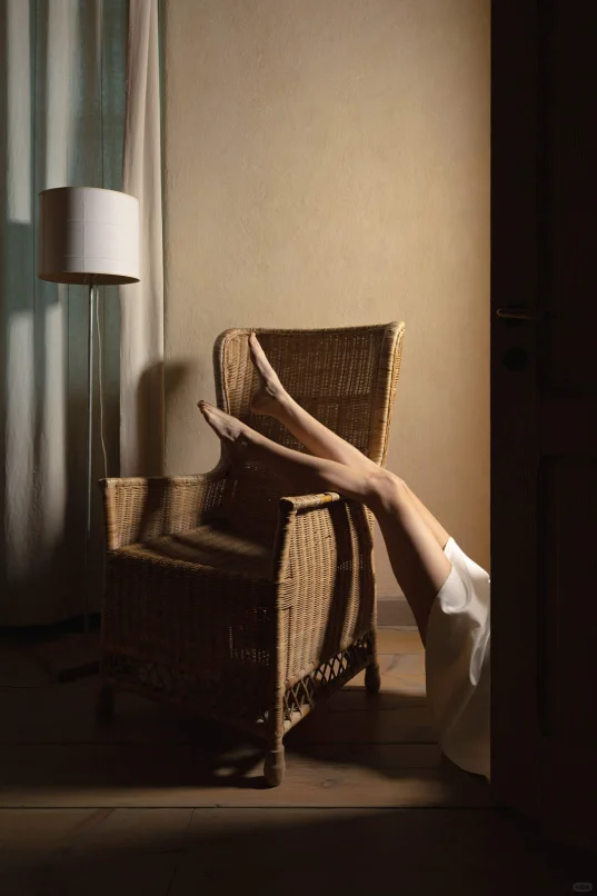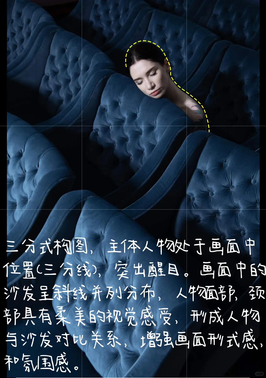[一R].构图:三分式构图,主体人物处于画面中位置(三分线),突出醒目。画面中的沙发呈斜线并列分布,人物面部,颈部具有柔美的视觉感受,形成人物