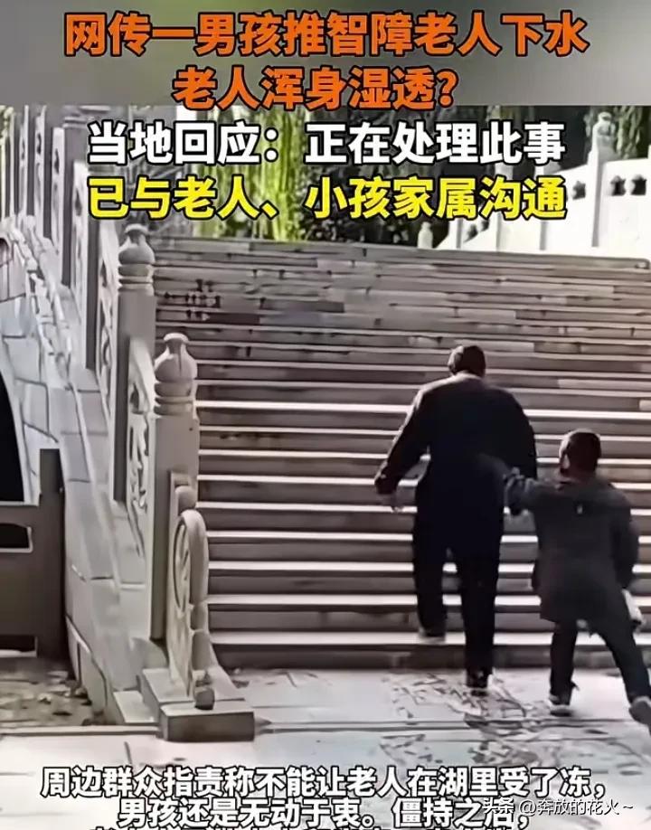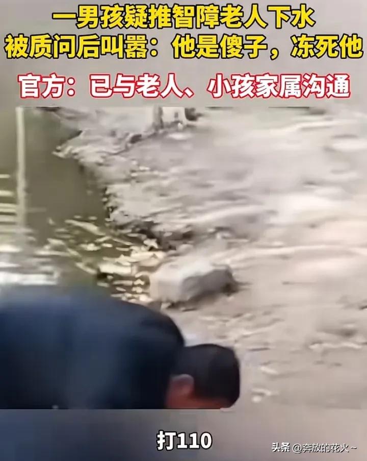 目击者12月7日发视频爆料:河南封丘县人民公园里,一男孩把智障老人推进河水里,这个男孩在面对拍摄博主的质问,为什么不让老人出来时?然而该男孩语气冷漠强硬地反驳说;你别管,他是傻子,就是要冻死他,男孩并称与水里的老人认识,是他们老家那边的,视频显示此时站在水里的老人,一边冻的瑟瑟发抖,一边战战兢兢可怜的看着男孩不敢上岸。 目击拍摄者与口气生冷毫无悔改的男孩几番沟通无果后,有群众拨打了110,该男孩一看报警了,才肯让水里的老人上来,老人浑身湿漉漉的打着冷颤,该男孩一边跟在老人后面骂骂咧咧,还一边粗暴的推搡着老人,此事当地官方已经介入,已与老人、和小男孩家属沟通。 可并没通报后续是否对该男孩如何处罚,但男孩的行为令很多网友们气愤,竟然还有替这个男孩辩解的网友称,小男孩还小不懂事,可能是和老人在闹着玩,没必要上纲上线,看到这样无知网友的评论,真是让人无语。 我发现遇到像这种极端不良的孩子,你试图与他的父母去沟通,让他好好教育自己家孩子,然而你会发现这个孩子的全家,最不正常的是这种孩子的家属!