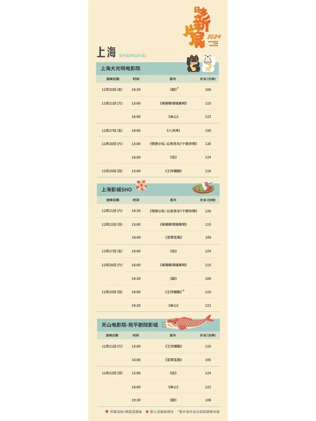 本次影展还有惊喜活动将于近日继续揭晓。影片将于12月20至22日和12月27至29日的两个周末在上海大光明电影院、天山电影院-宛平剧院影城、上海影城SHO三家影院与影迷见面。影展活动信息、开票及衍生品详情等内容,请持续关注【上海国际电影节】公众号的后续推送。
