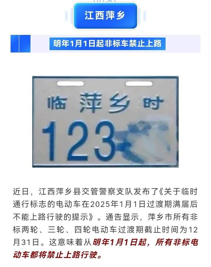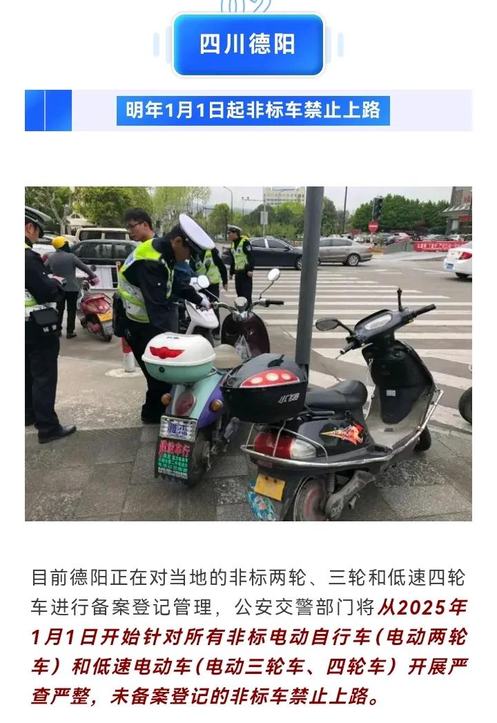 明年1月1日起,部分城市非标电瓶车将禁止上路,否则将面临罚款或扣留车辆。 非标电动车:电动自行车时速不大于25km/h,重量不大于55公斤,电机功率不大于400W,必须要有骑行脚踏功能,电池电压要不大于48V,两轮间的轴距要不大于1250mm,最大宽度不大于450mm。 广东广州2024年12月30日起施行《广州市电动自行车管理规定》,规定共8章55条。其中的一些规定: 1、在非机动车道内行驶时最高时速超过15km/h; 2、以手持方式使用手机等电子产品、吸烟、饮食等妨碍安全驾驶; 3、在骑行经过交通流量大路段、交叉路口、人行横道等容易发生危险的路段时超车; 4、逆向行驶; 5、醉酒驾驶; 违反上述任意两项规定,由公安机关交通管理部门依法责令改正,处警告或50元以上200以下罚款。 相信不久之后,全国都将实施这些措施!