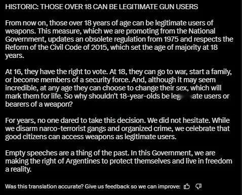 阿根廷将合法持枪年龄降低至 18 岁 政府刚刚更新了 1975 年的一项法律,将 18 岁定为拥有枪支的法定年龄——称这是现代阿根廷早该实现的改变。 阿根廷国家安全部长帕特里夏·布尔里奇认为,如果18岁的年轻人有投票权和参军权,那么他们也应该有合法拥有武器的权利。 布尔里奇:“18岁时,他们可以选择参战、组建家庭或成为安全部队的成员。 为什么他们已经满 18 岁了,却还不能合法使用或携带武器呢?” 来源: PatoBullrich