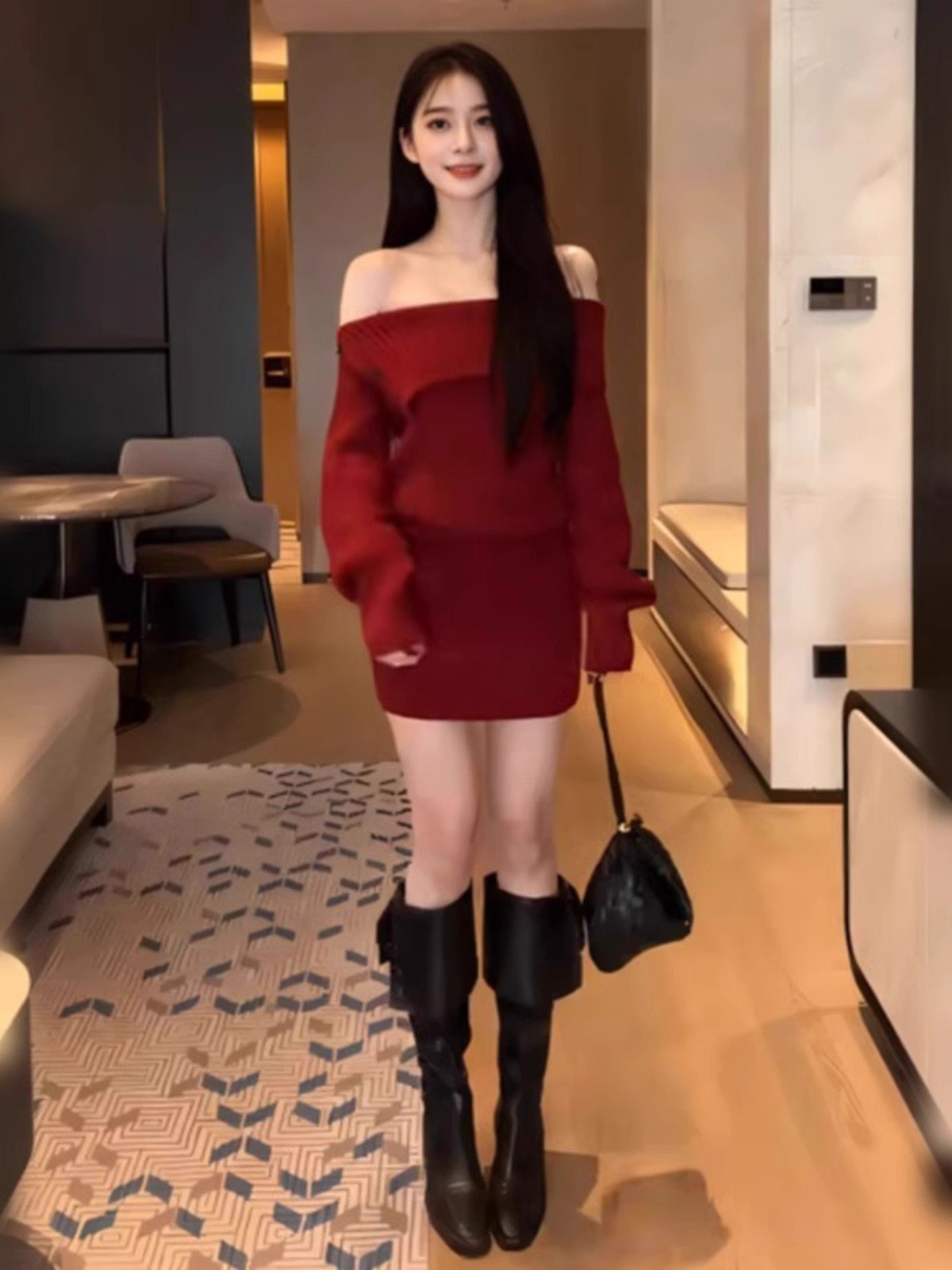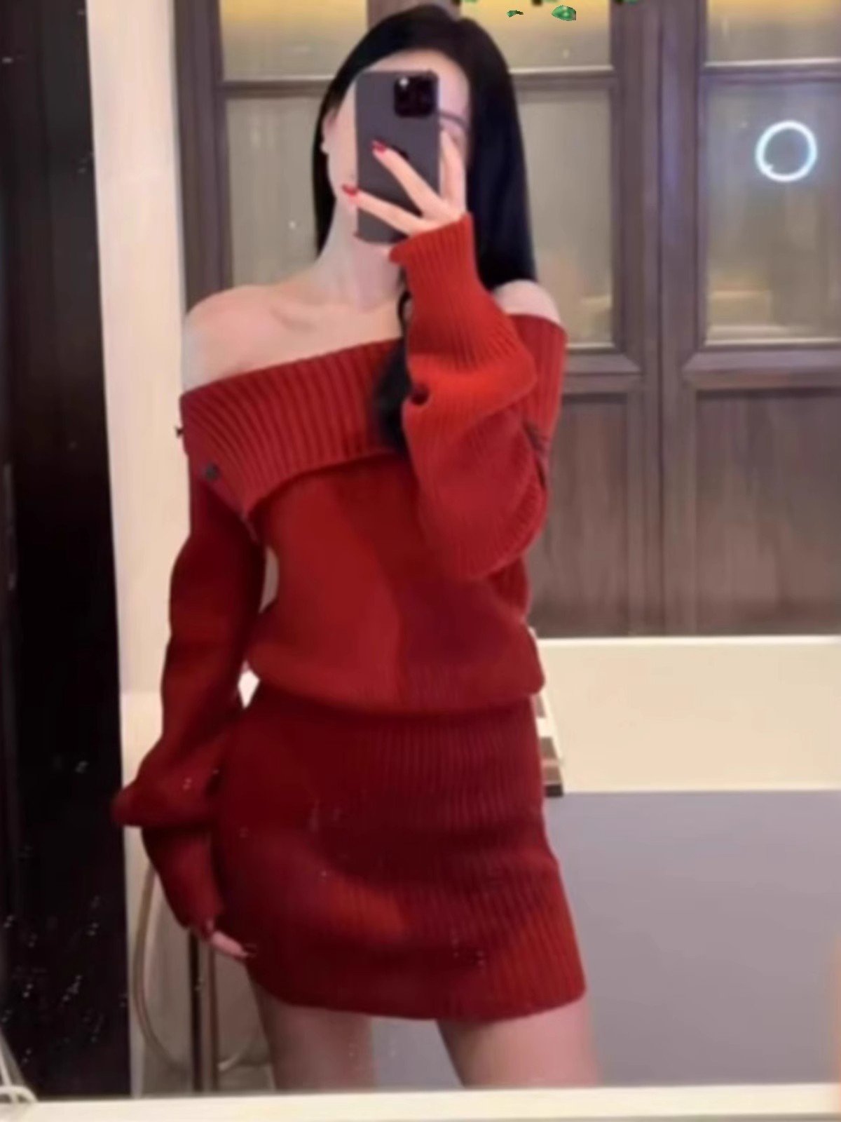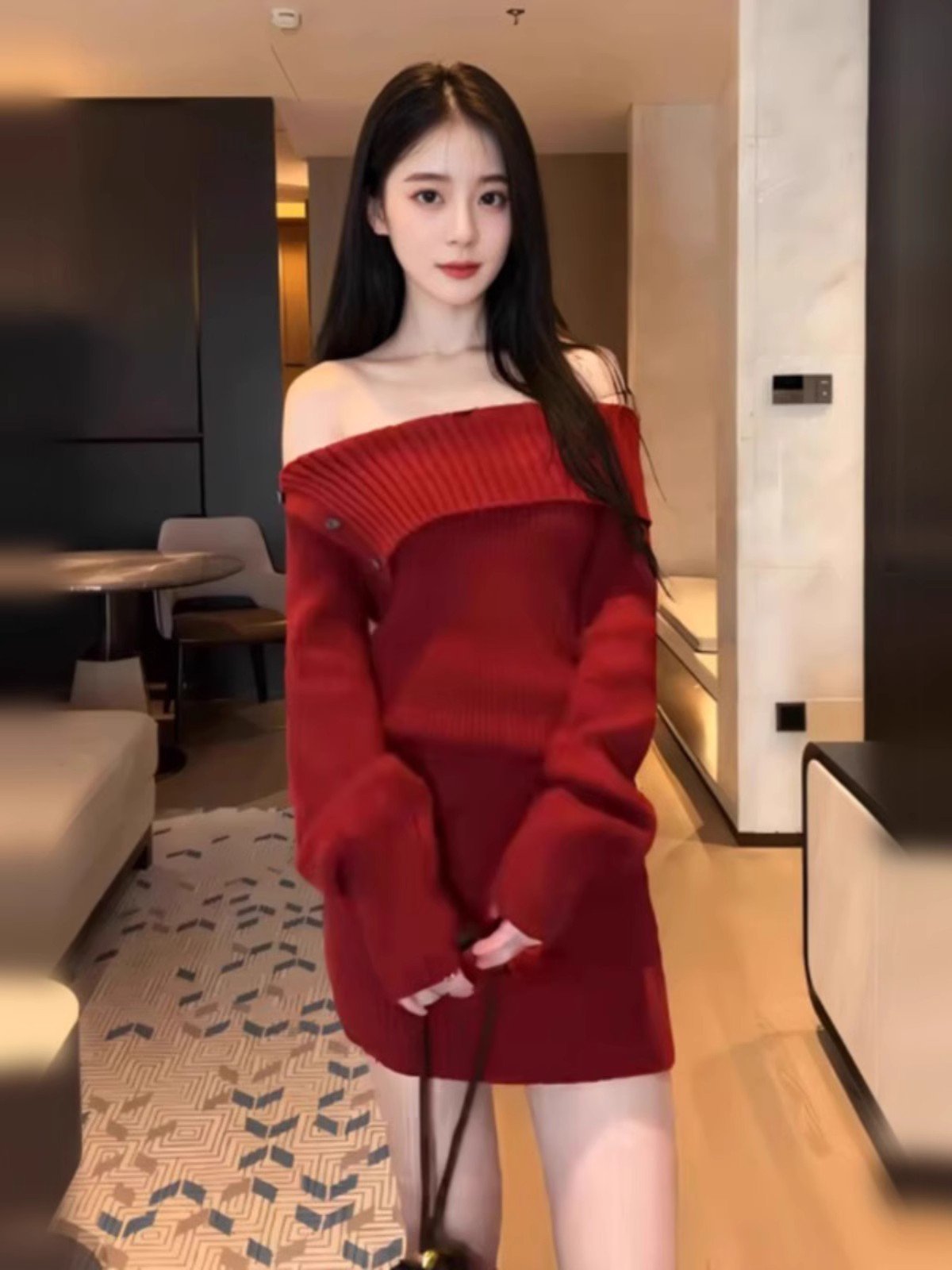 性感红色一字肩针织连衣裙女冬季圣诞穿搭