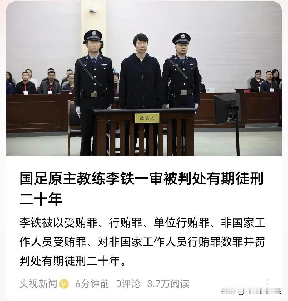 李铁一审判决出来了,没有判死刑! 很多球迷认为李铁应该判死刑,但12月13日,据央视新闻的报道,国足原主教练李铁一审被判处有期徒刑20年! 我之前就认为,他被判死刑的几率也不大,但20年对他来说,就算在里面表现的好,能够获得减刑的话,他是1977年出生,今年47岁了,就算是减刑到15年出来的时候,也60多岁了。 现在在看李铁执教国足时,在新闻发布会上说的一些言论实属是荒唐,他曾说过:我做事的一个准则就是,少说话,多做事! 万万没想到,这个原国家队中场8号球员,当了国家队主教练之后变了,原来一门心思着想着多捞钱,而不是将所有精力放在如何将国家队主教练提升上去。 不过让我们欣慰的是,现在的国家队给人一种眼前一亮,脱胎换骨的感觉,而且这不仅仅是感觉,因为我们明显看到如今的国足在技术上有了很大的改善,这也让我们看到了希望。 而李铁案一审已经判决了,可以说关于他的故事也尘埃落定了,就让我们期待国足在新任主教练的带领下,能够提出更好的成绩吧!