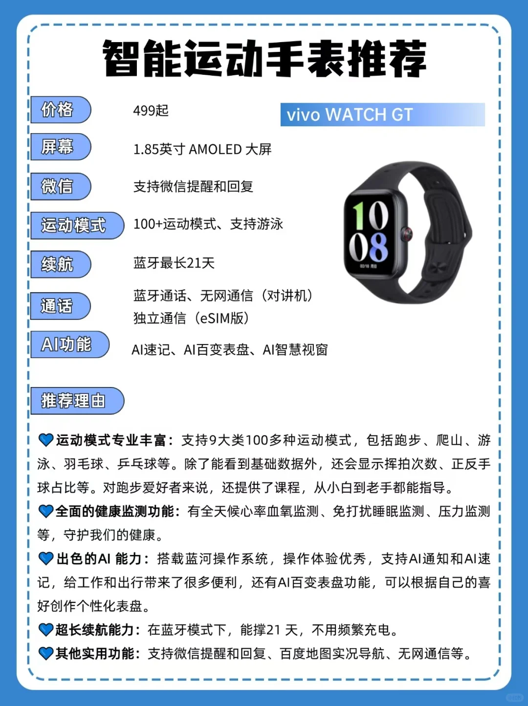 ⌚vivo WATCH GT:性价比高,健康监测数据精准,运动数据显示专业,外出跑步时可以在手表上回微信,还能无网对讲。