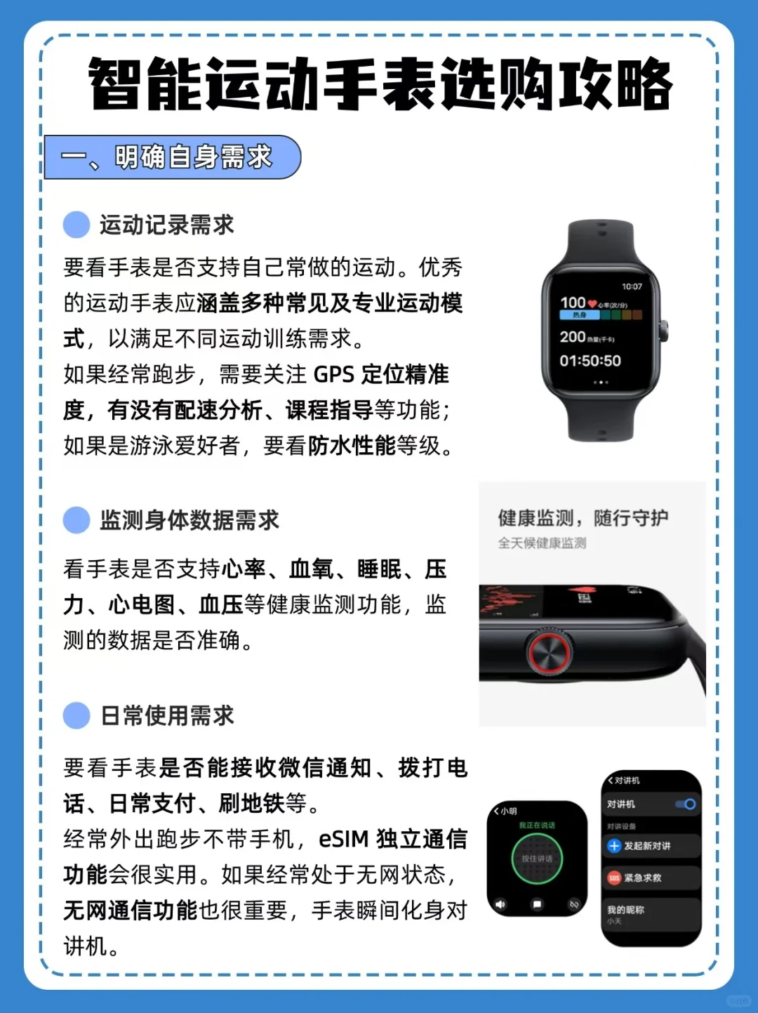 首先应该明确自身需求,是为了记录运动数据or买给家里老人,还是图方便,想在手表上接收微信消息、刷地铁卡。