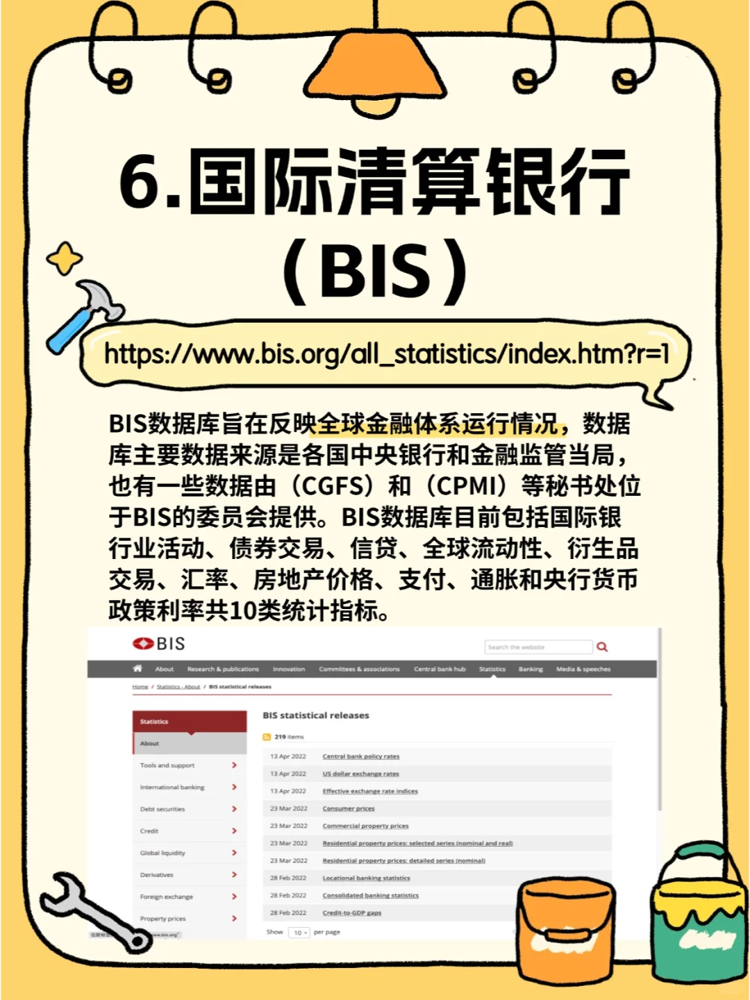 - BIS数据库反映全球金融体系运行情况,包括国际银行业务、债券交易、信贷等10类统计指标,是金融研究的重要数据来源。