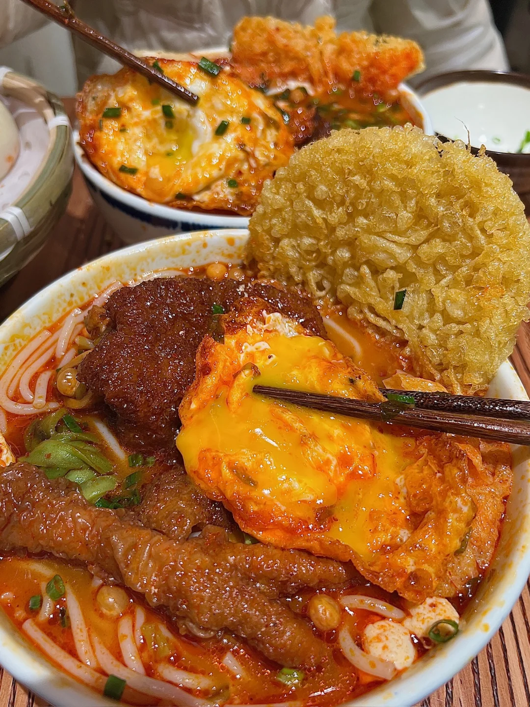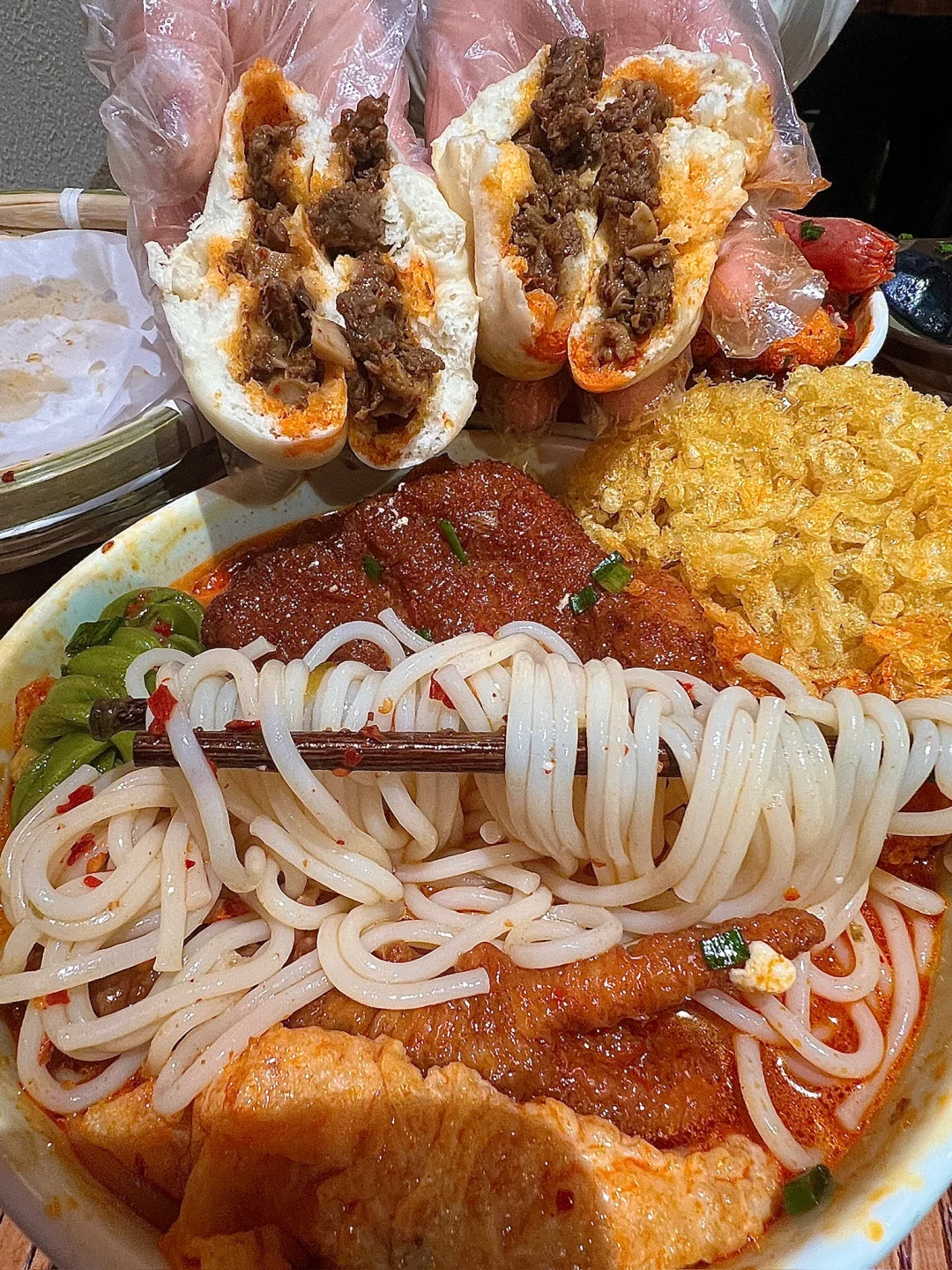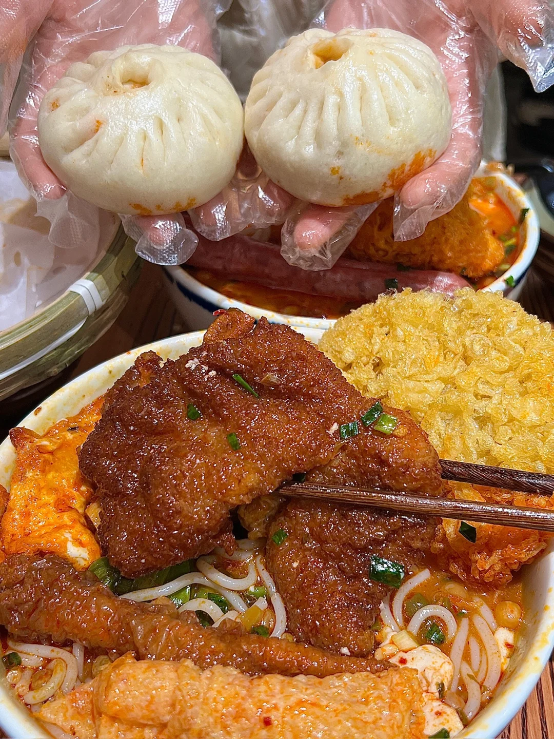 吃下这一口烟火气 跟朋友去外地玩之前跑到这边打包的好吃的米线 果然没令人失望🥺料jujujuju丰富可以单➕ 💰9.9一份的米线(单➕的浇头都是个位数) 臭豆腐花是这家的特色!!跟米线一起进嘴爽嫩滑 流心的溏心蛋🍳泡在米线汤里吸满汤汁儿巨好吃 纸皮包子里面是牛肉馅的!!馅料里面的肉超多的