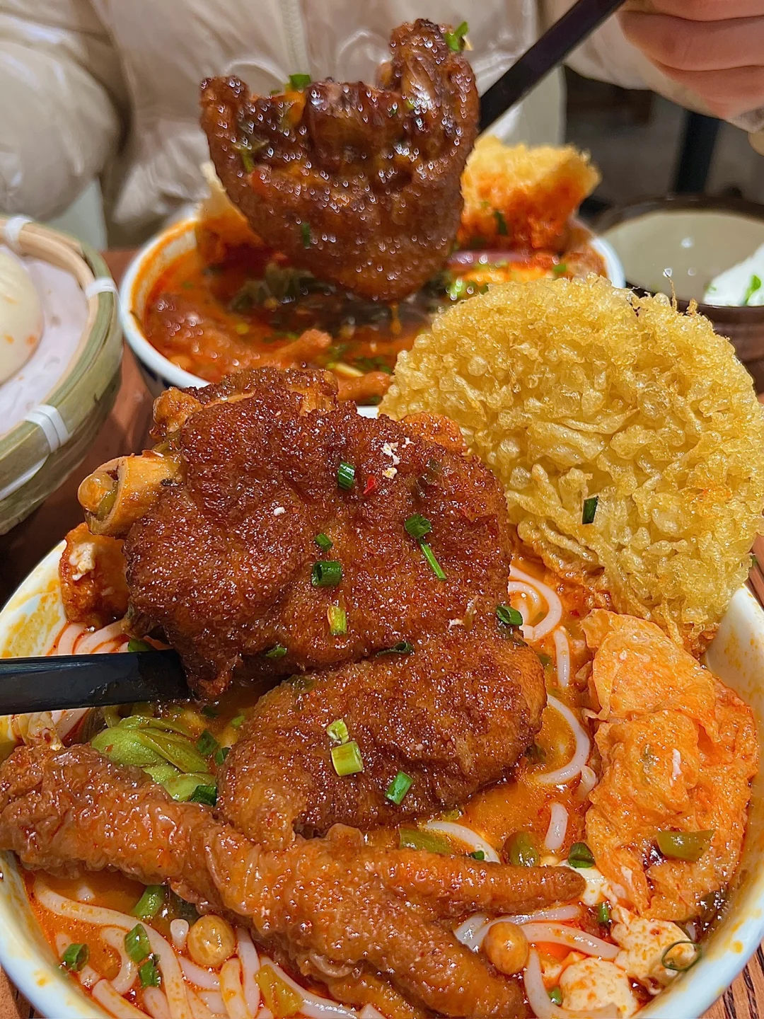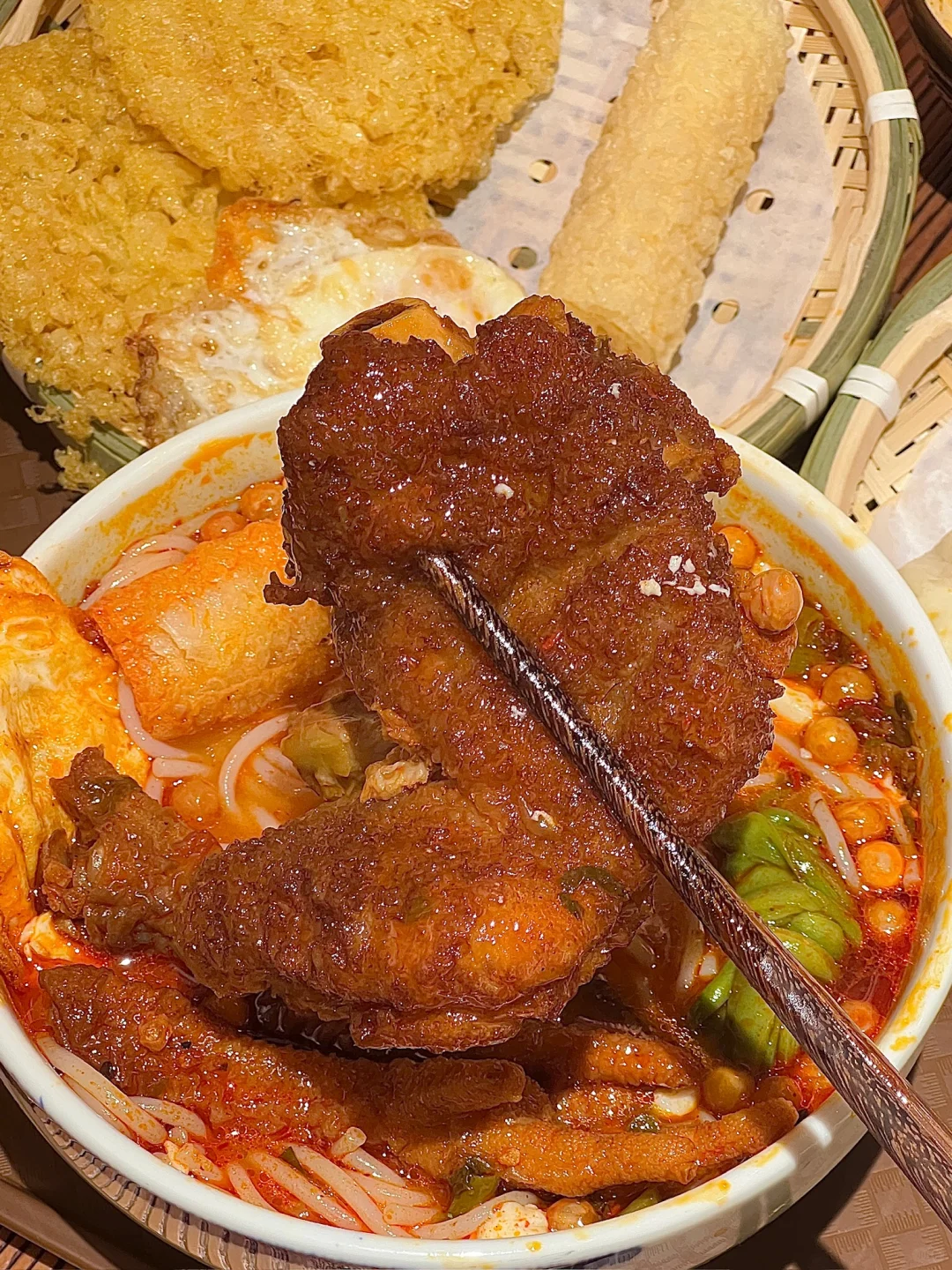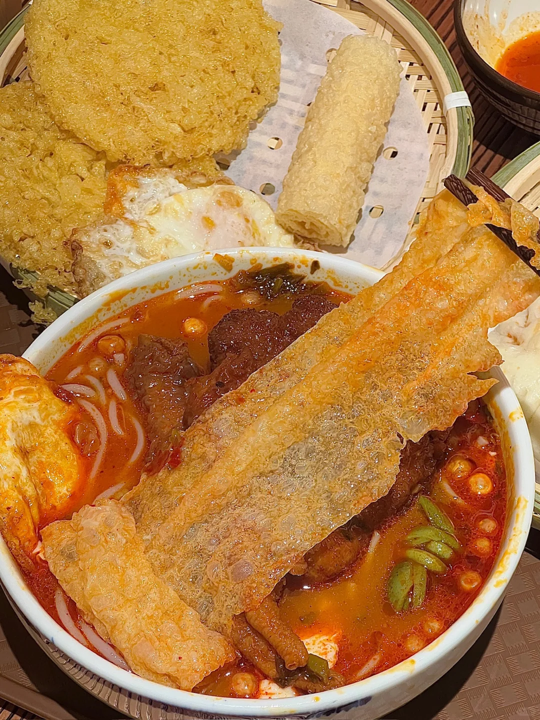 吃下这一口烟火气 跟朋友去外地玩之前跑到这边打包的好吃的米线 果然没令人失望🥺料jujujuju丰富可以单➕ 💰9.9一份的米线(单➕的浇头都是个位数) 臭豆腐花是这家的特色!!跟米线一起进嘴爽嫩滑 流心的溏心蛋🍳泡在米线汤里吸满汤汁儿巨好吃 纸皮包子里面是牛肉馅的!!馅料里面的肉超多的