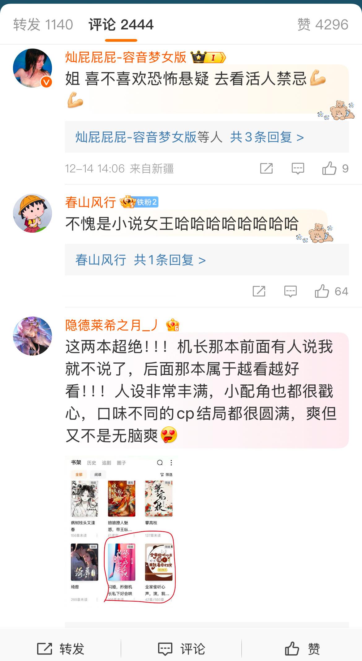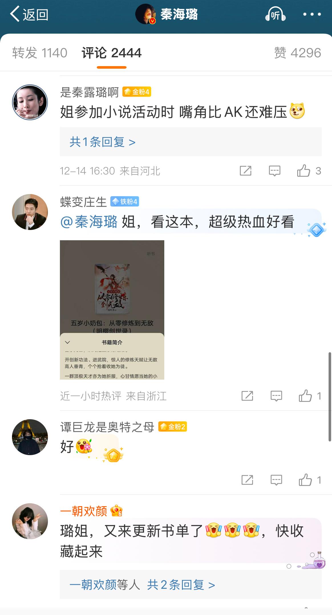 秦海璐小说书单又上新了 海璐姐又来推荐书单了!!不愧是小说女王,扫文速度真的一绝,想起之前在小说活动上嘴角难压的模样完全演我哈哈哈!姐还推荐了我最近在追的《攀高枝》,呜呜,我和姐同担了谁能懂啊!!!张知序真的是最好的大仙!!我照着姐的书单看,我是不是也能飞上枝头变凤凰!